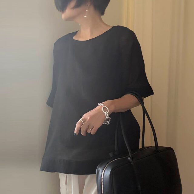 このブラウスの先日過去コーデ。白いワイドパンツと合わせていた。