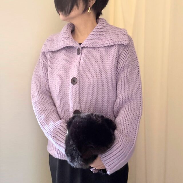 サーモンピンクの綺麗色と暖かさが気に入ってるUNFILOのニットでコーデ。