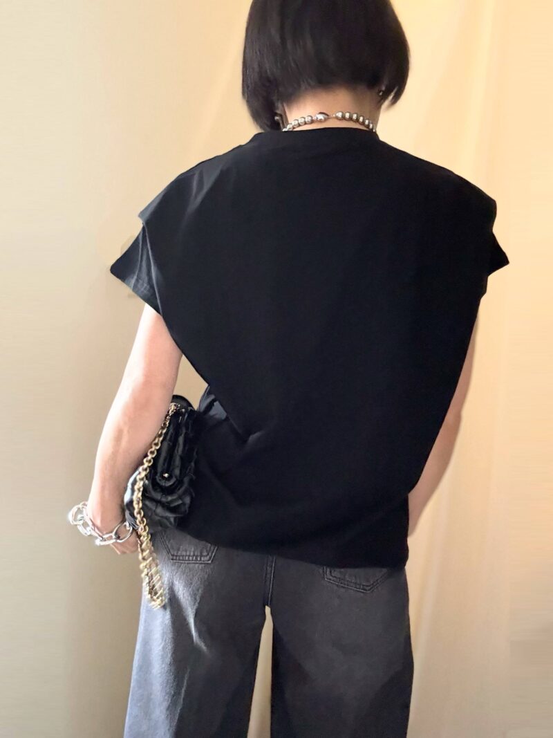 ↓こんな感じで肩~二の腕のもたつきを完全カモフラージュしてくれるデザイン。ホント助かる!