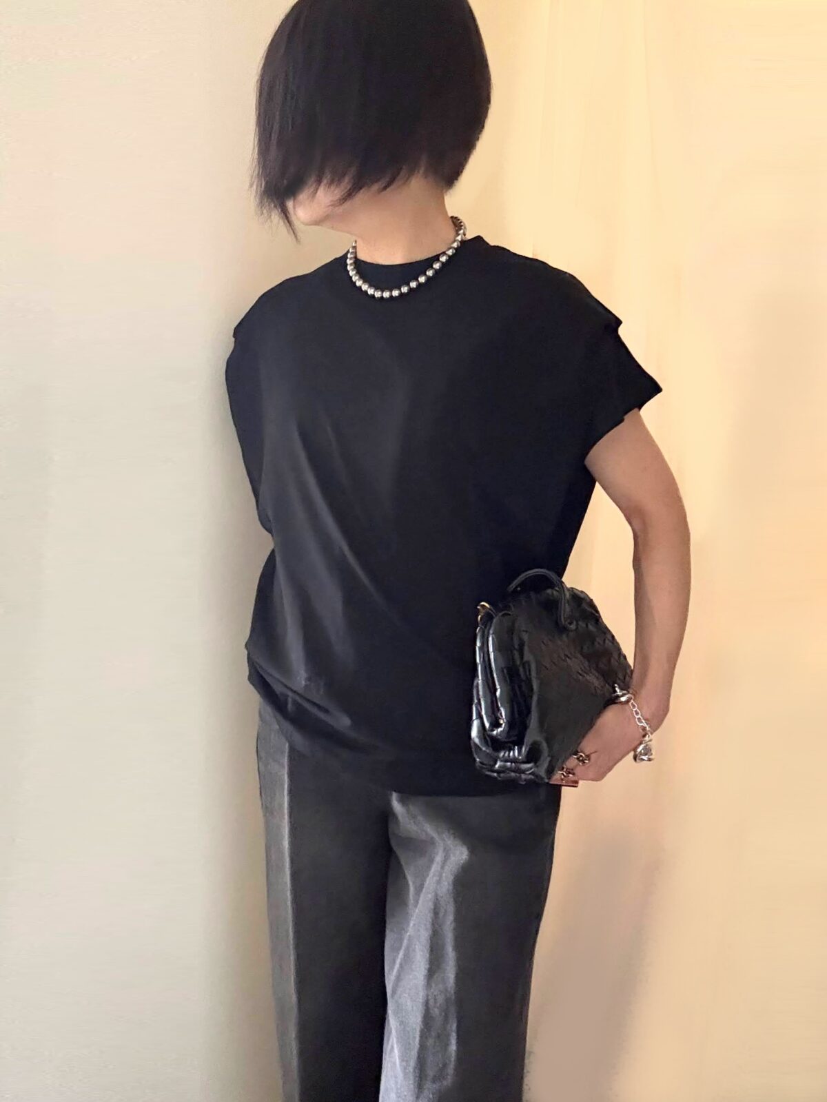 思った通り、このグレーのパールセット、黒のTシャツとの相性も抜群!ラフなカジュアルウエアも一気に盛れる。