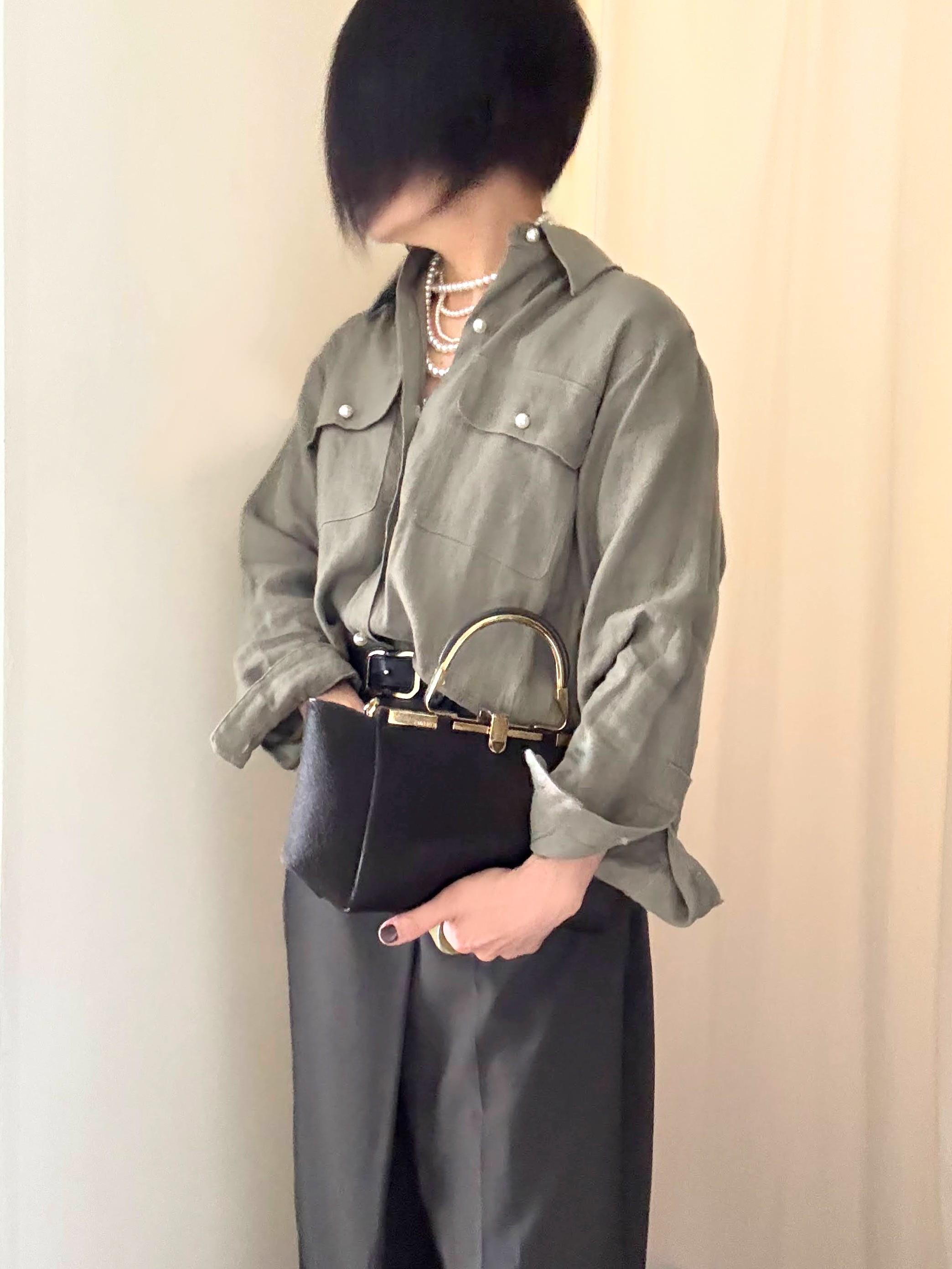 なんかジュエリー系を盛ってバランス取らないと!アクセサリーで盛る。グレーパールでクールに。