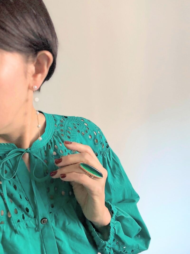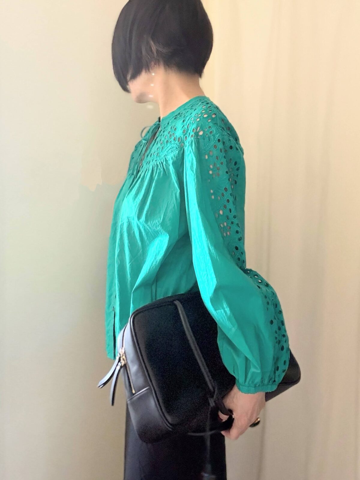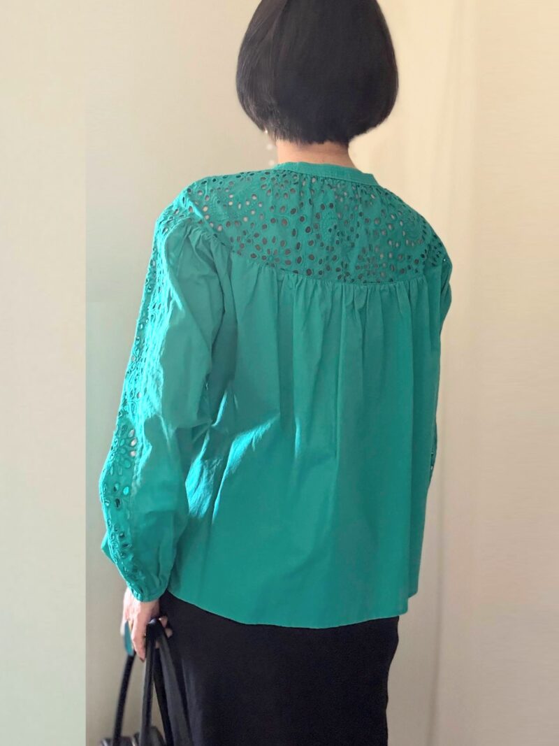 鮮やかエメラルドグリーン色のカットワークのブラウス。