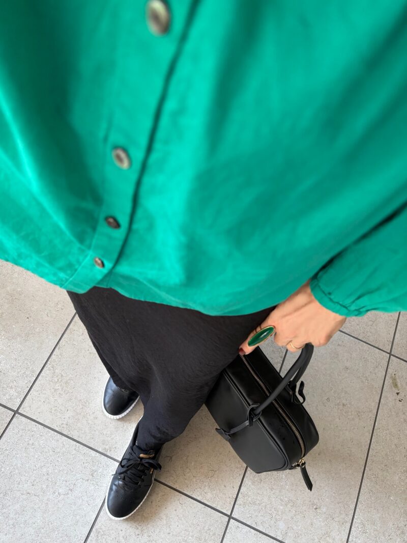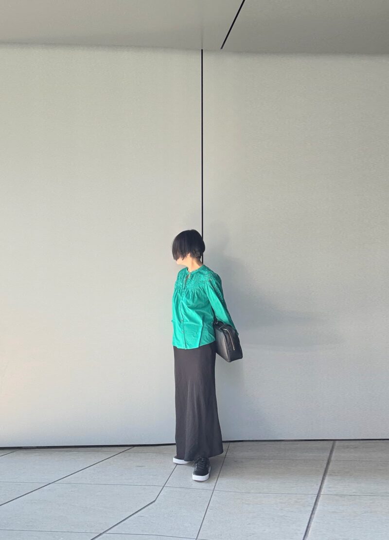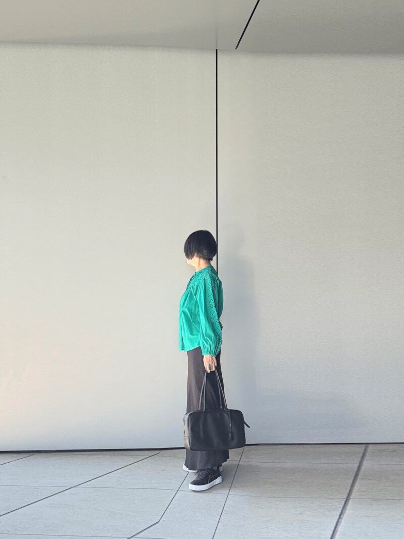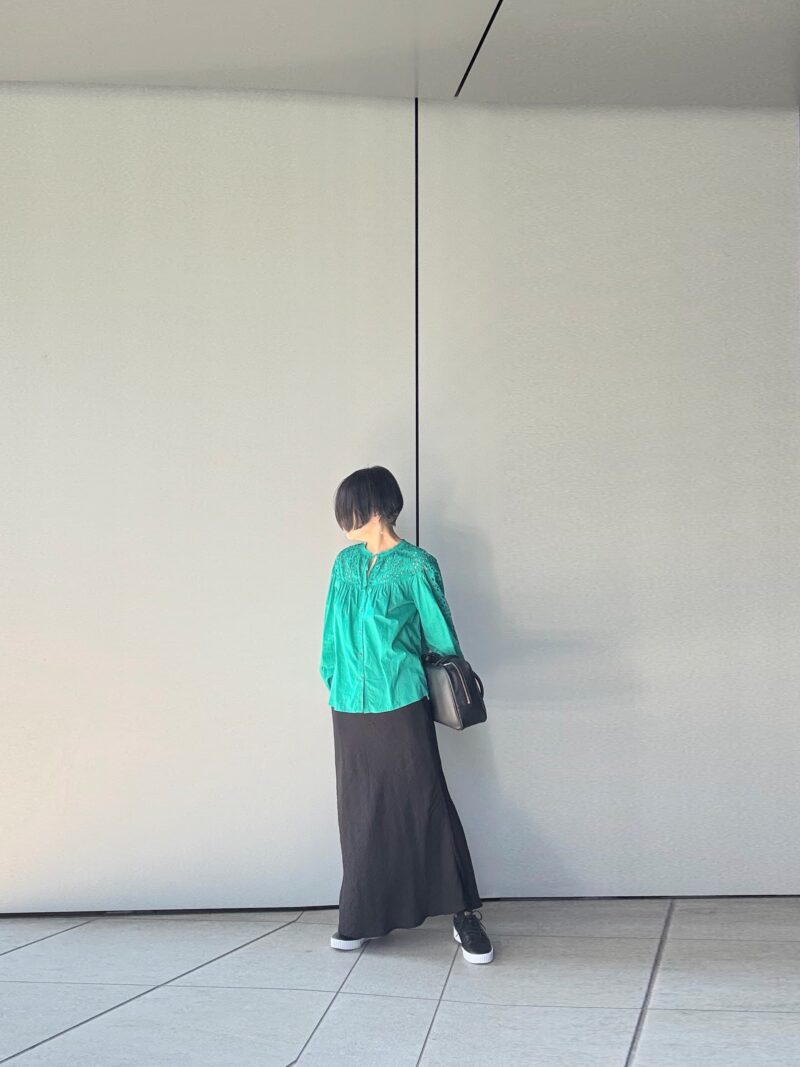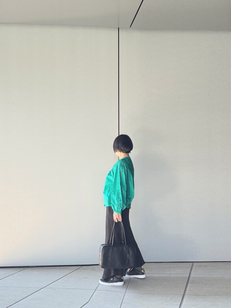 全体。ブラウスの色を生かすためにスニーカーもバッグも黒で統一。