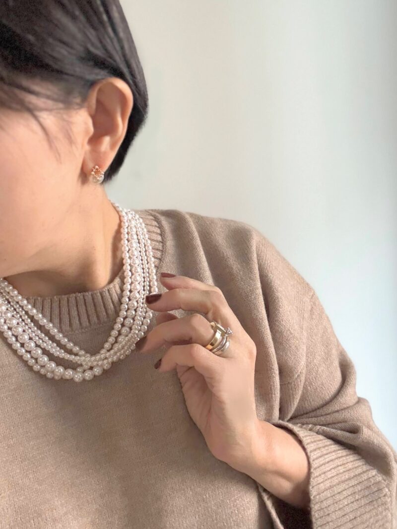 アクセサリー。ベージュ系のコーデには多連パールがピッタリ。