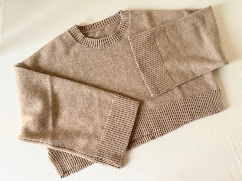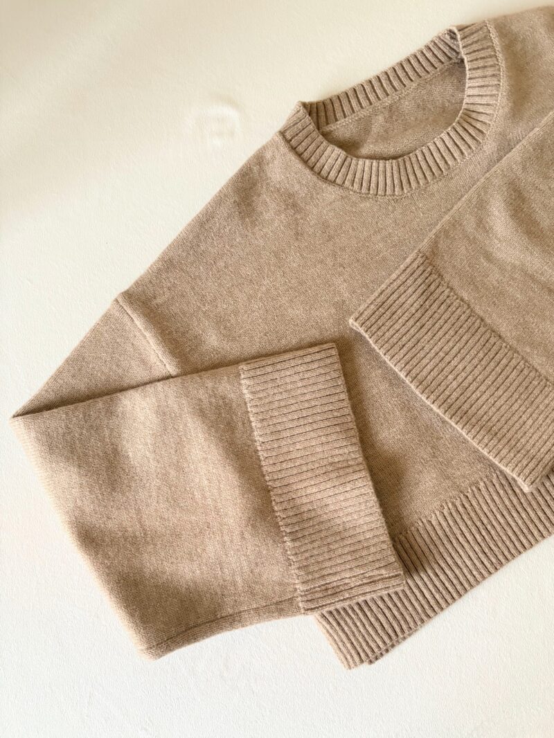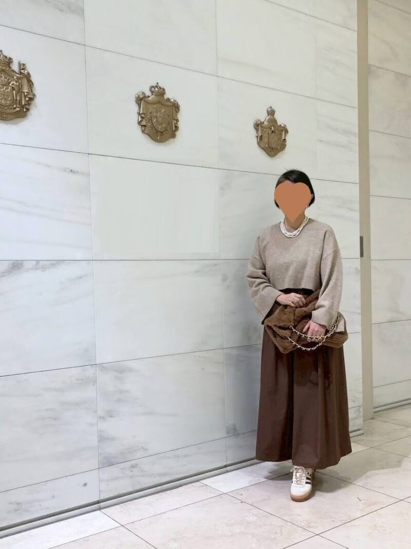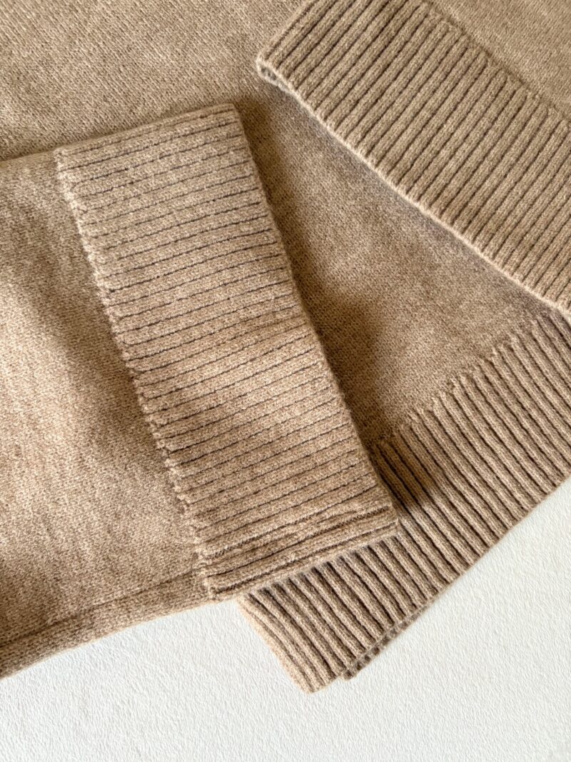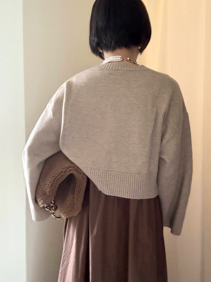 私が着ているのベージュはベタ感がなくて優しい杢調かな。白やこげ茶が合わせやすい。