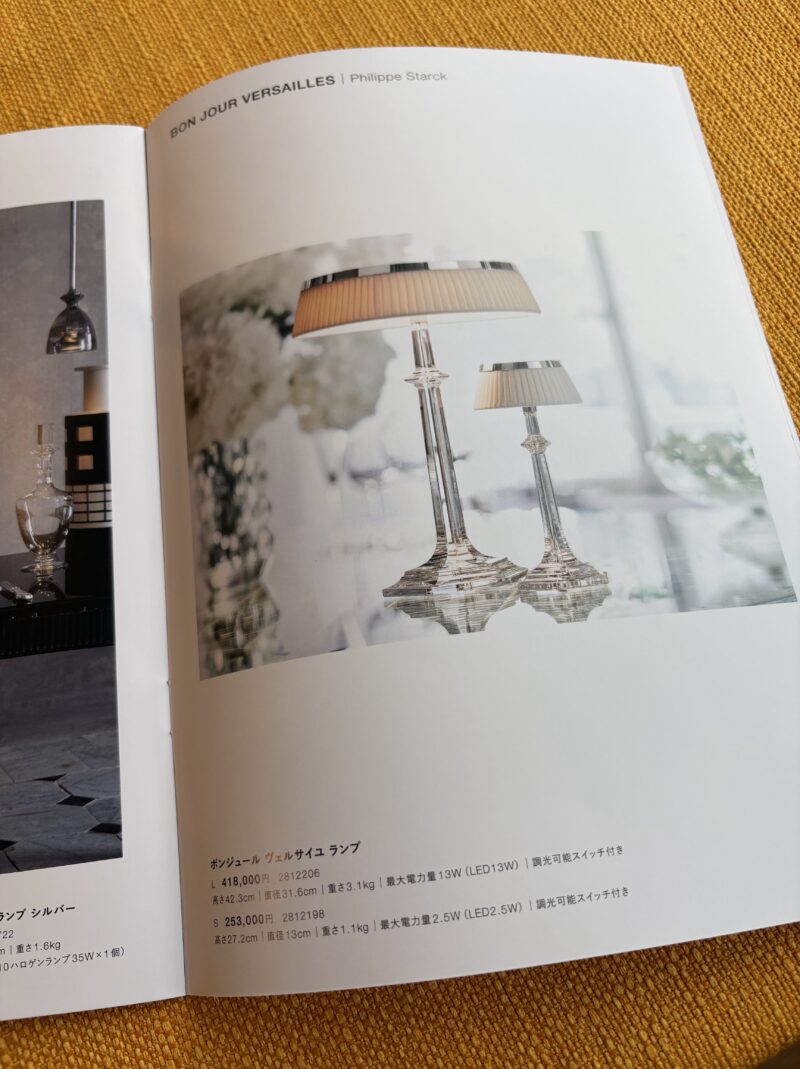 スタルクデザインのFLOS社の照明が大好きで(2つ持っている)私のハートを鷲掴みにする照明だった。お店の方が照明のカタログを下さった。