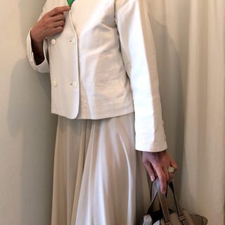 過去コーデ。白のピンタックブラウスと合わせていた日。この日のコーデ記事はこちら