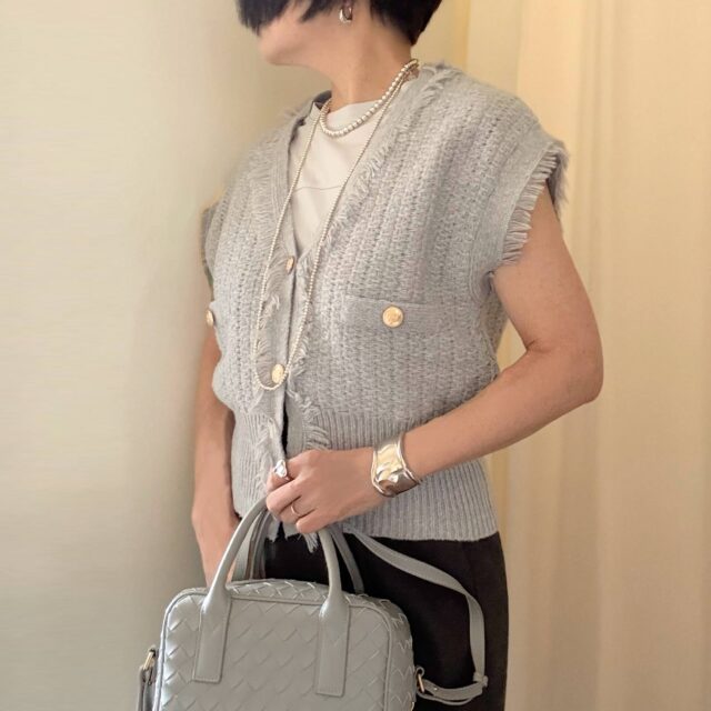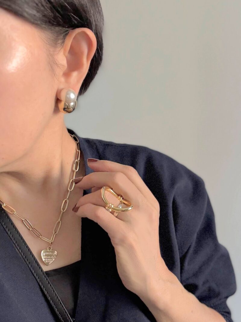 アクセサリーはこのカーディガンのGOLDボタンに合わせて。GOLDのボリューミーなものを。