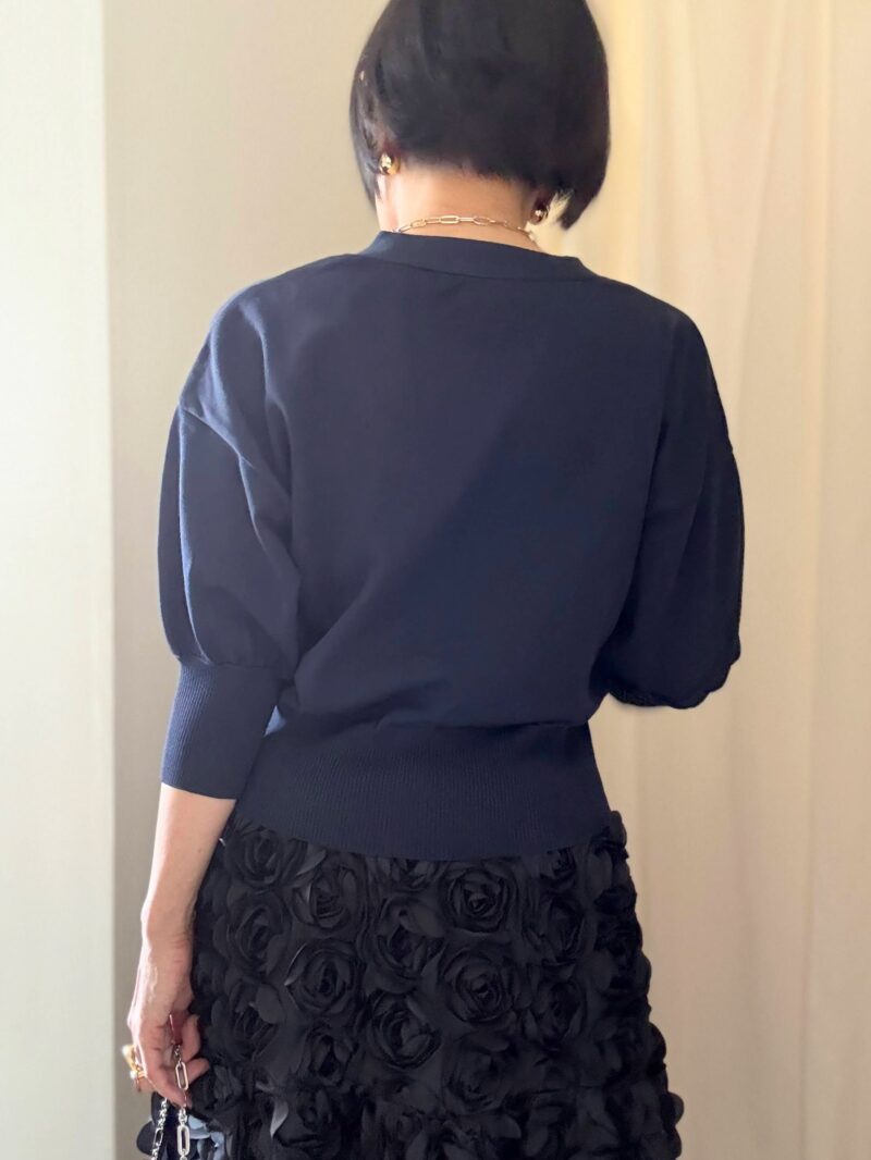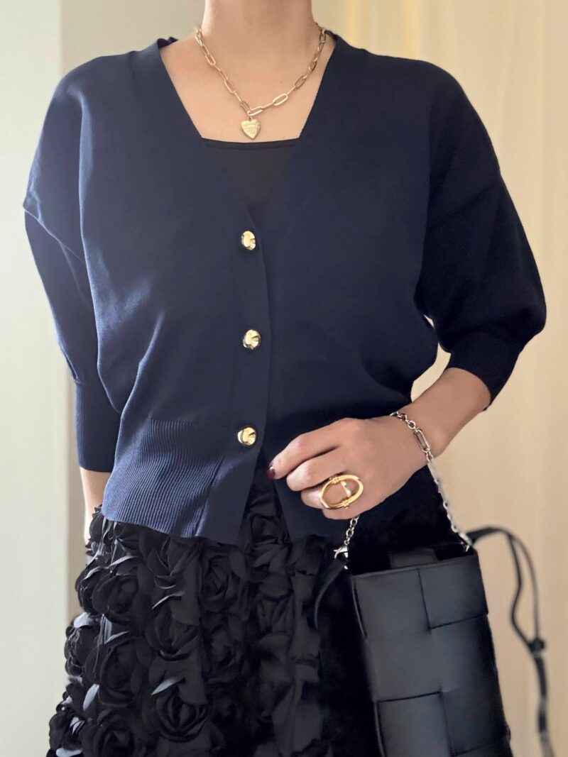 上半身は金ボタンがゴージャスな5分袖のニットカーディガン。