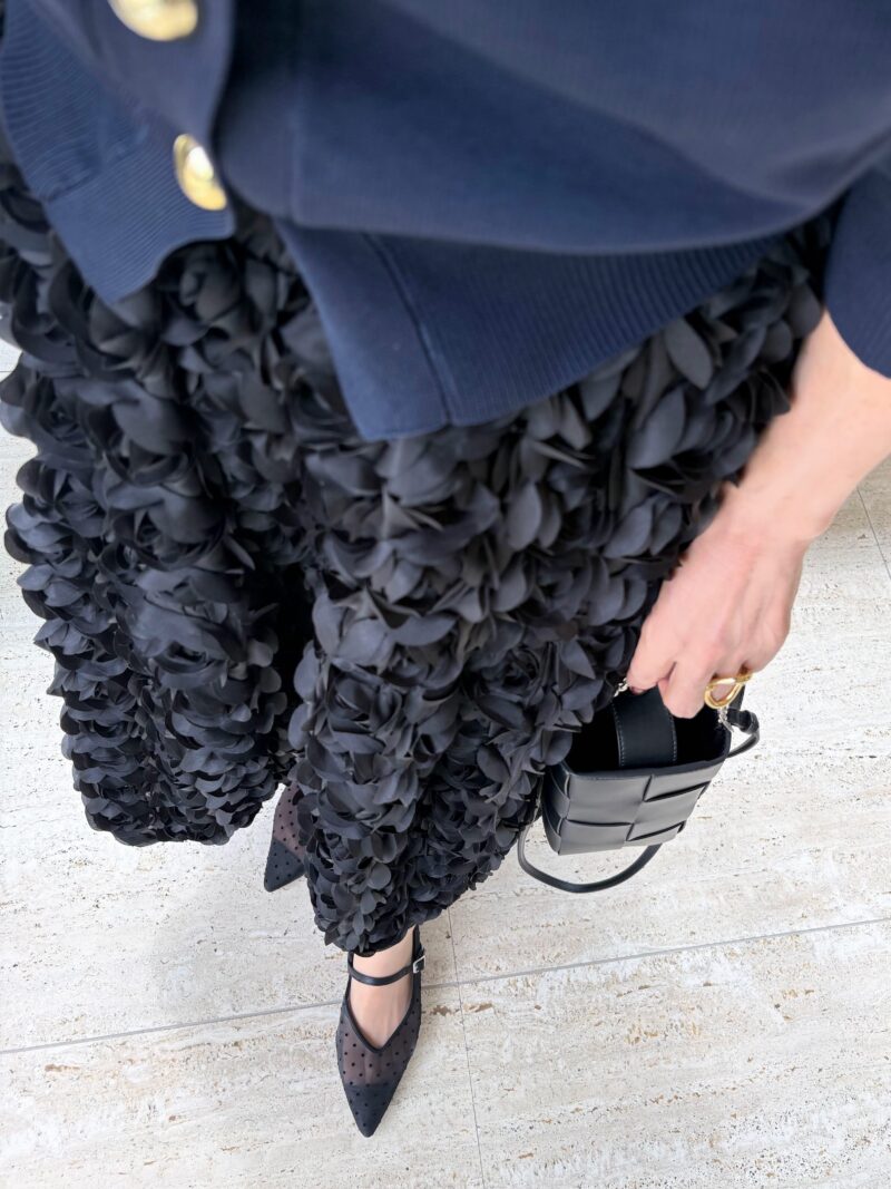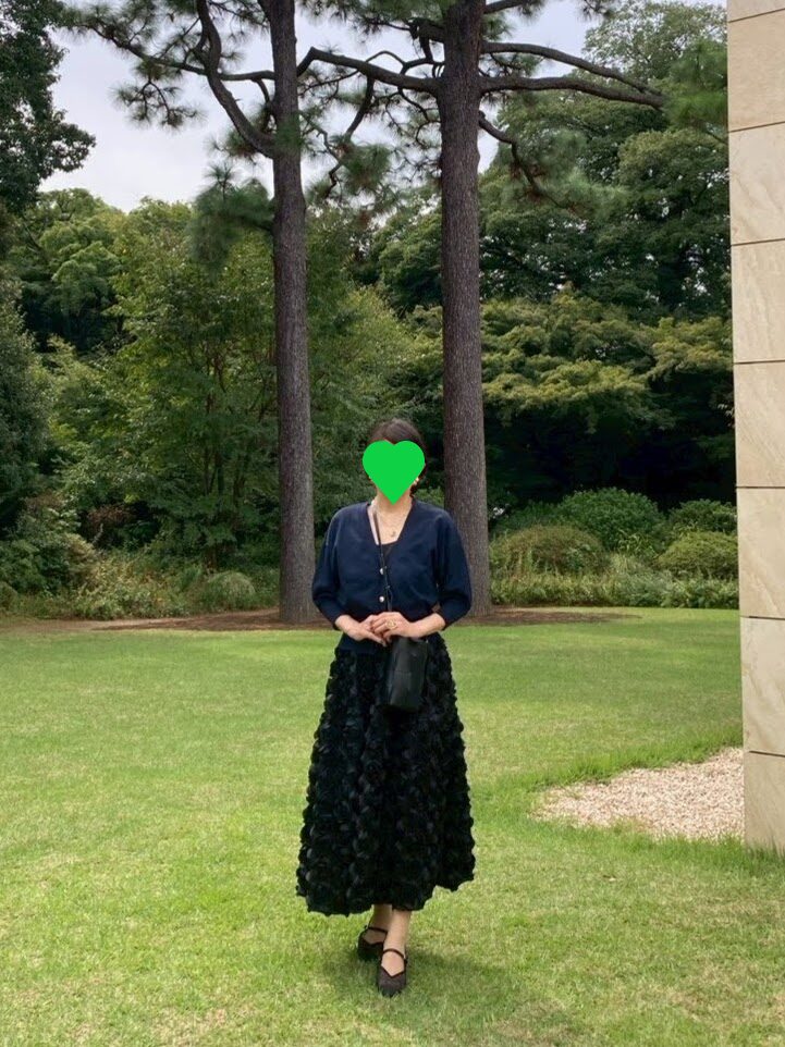 袖が控えめふんわり、ショート丈のなので今日のようなボリューミーなスカートにピッタリ。映えるカーディガン、という感じ。