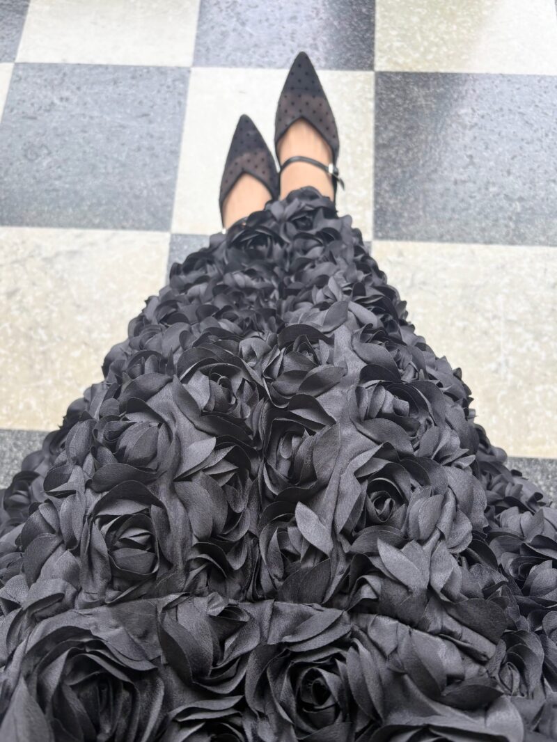 ・立体薔薇ののスカート:立体ローズ フレア ロングスカート ウエストゴム
