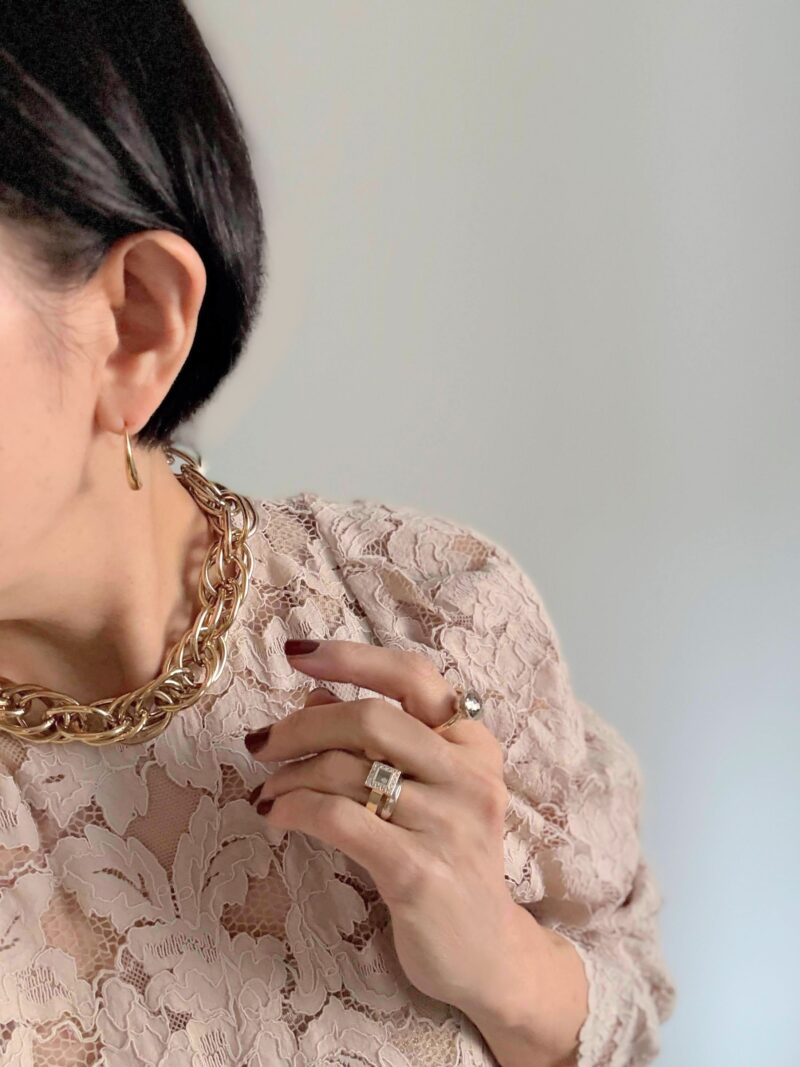 ボリューミーなGOLDチェーンにしてピアスはその分シンプル目に。あとは指に盛り。