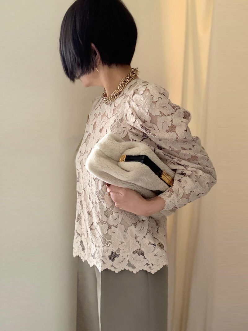 このブラウス、単体で糖度が高すぎる。甘すぎる。よって中和するためにボトムスはパンツの方がいいんじゃないか?と思って本日はキリっとセンタープレスのワイドパンツで。