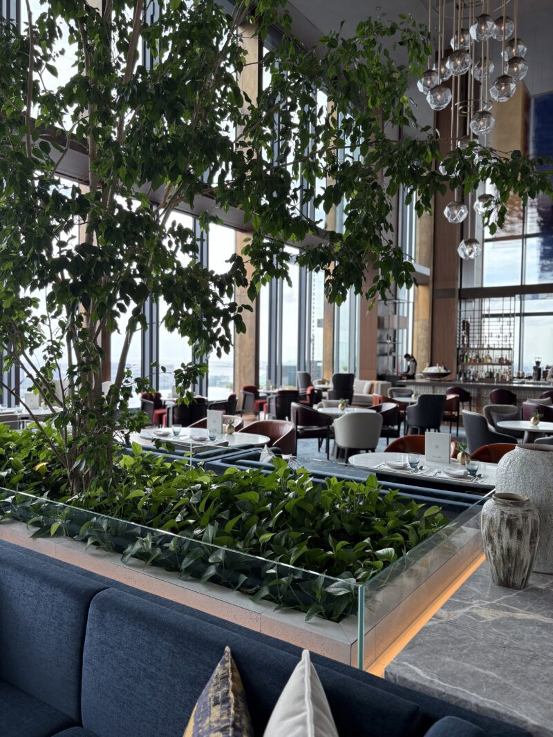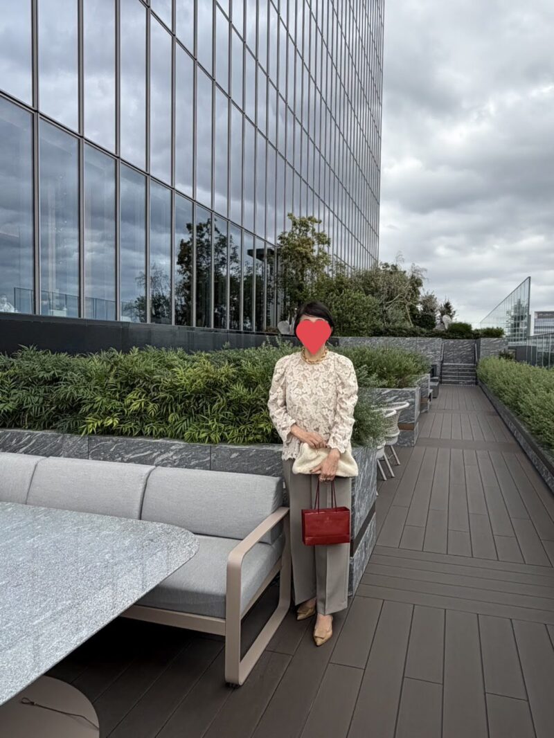 コーデ全体。ラウンジの外のテラスで。眺めが抜群!夜とか最高なのでは??