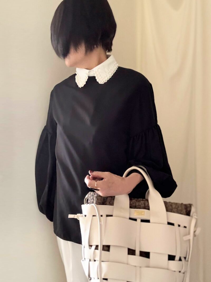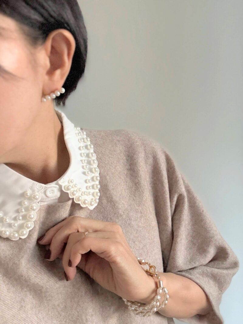 下半身はおじ靴におじパンツでメンズライク。でも上半身はパールの飾り衿+パールアクセサリーで逆に女らしく。このMIXコーデのさじ加減よ。端正感!・・・・好み!(*´▽`*)