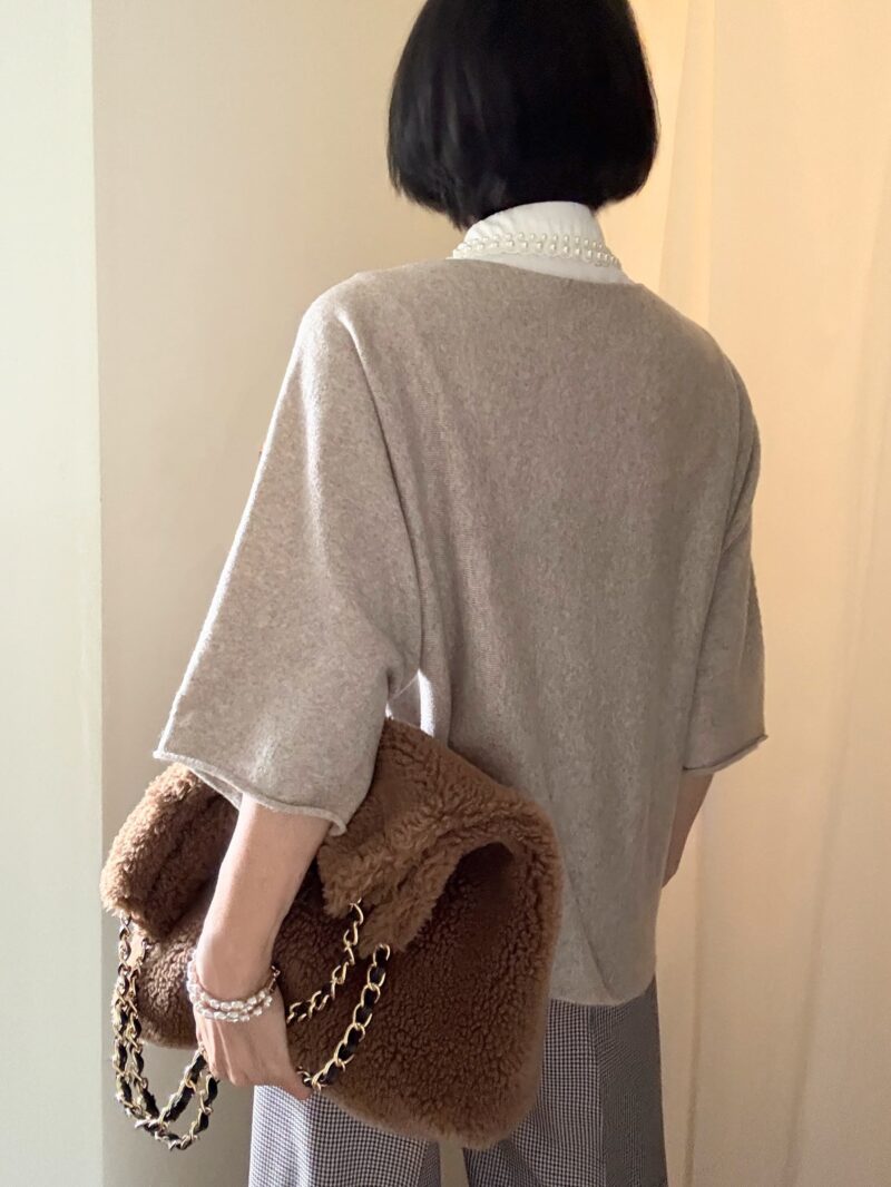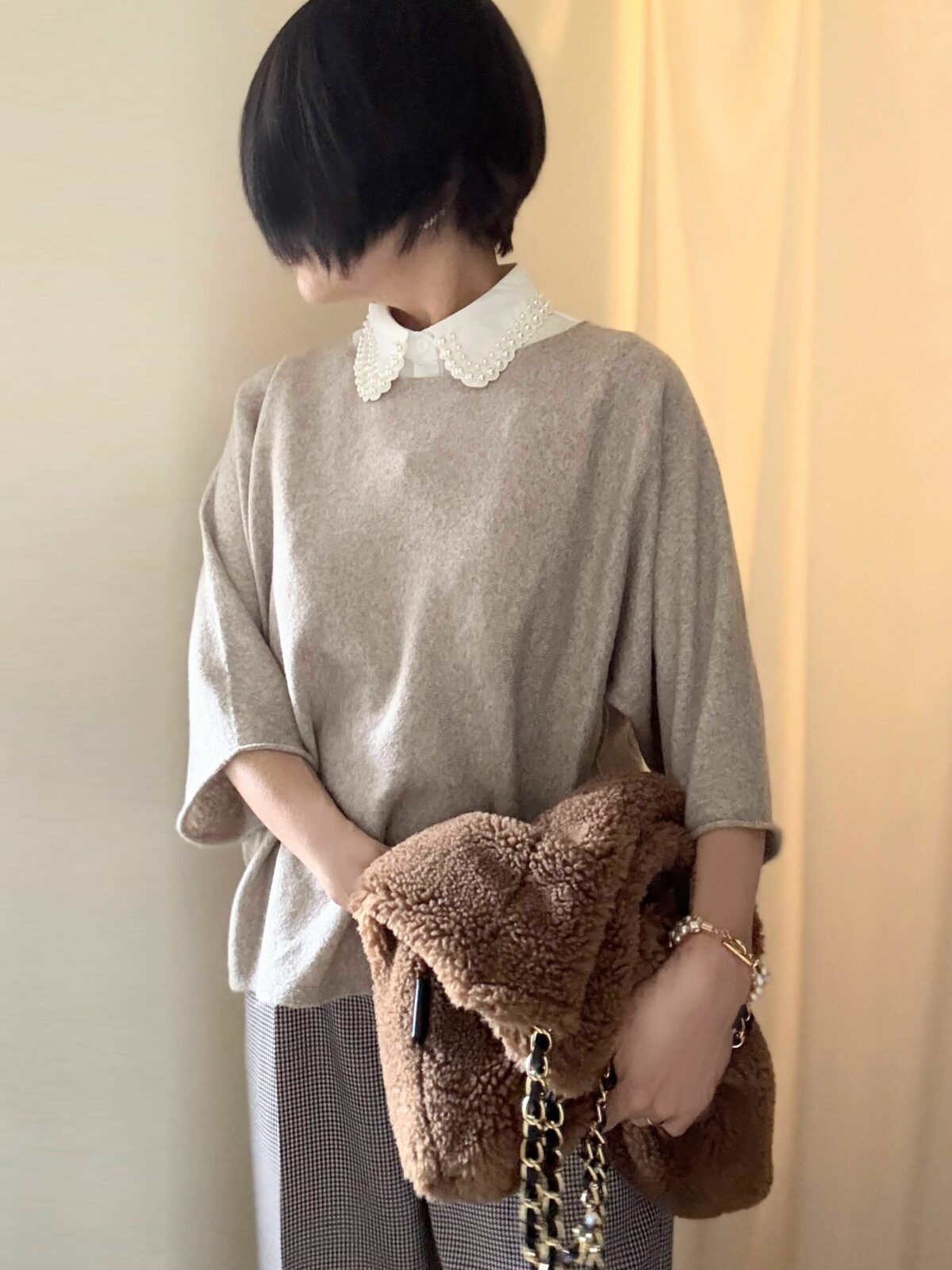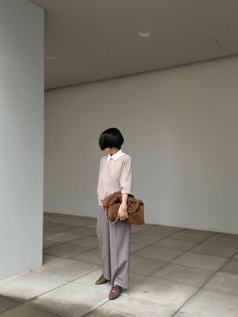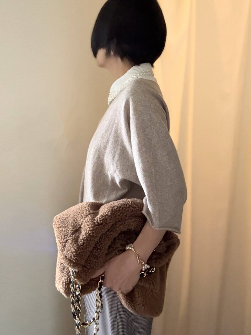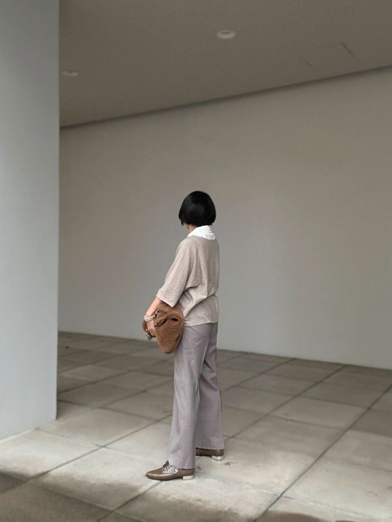 すごく柔らかいウール混紡のニット。薄手なんだけど伸縮性もあり、ユルッと着れてシンプルな形。これを今日は千鳥格子のおじパンツと合わせて端正コーデ。