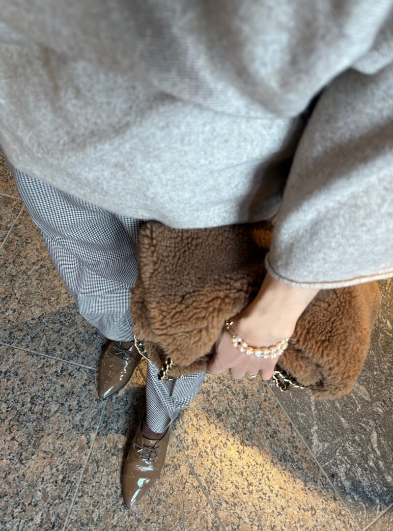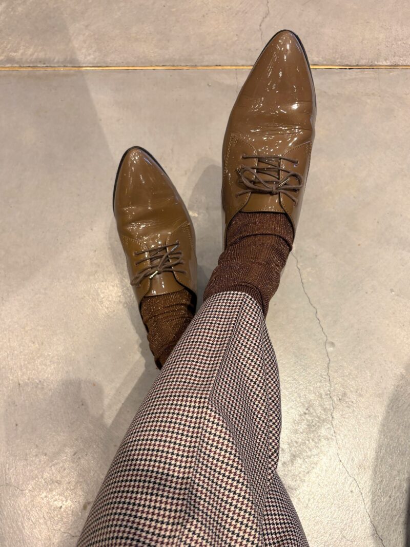 足元。千鳥格子のパンツが「おじパンツ(メンズっぽい)」だったので足元もおじ靴で。このオディットエオディールのひも靴は気に入ってもう長く履いてる溺愛シューズ。茶色のラメ靴下で。