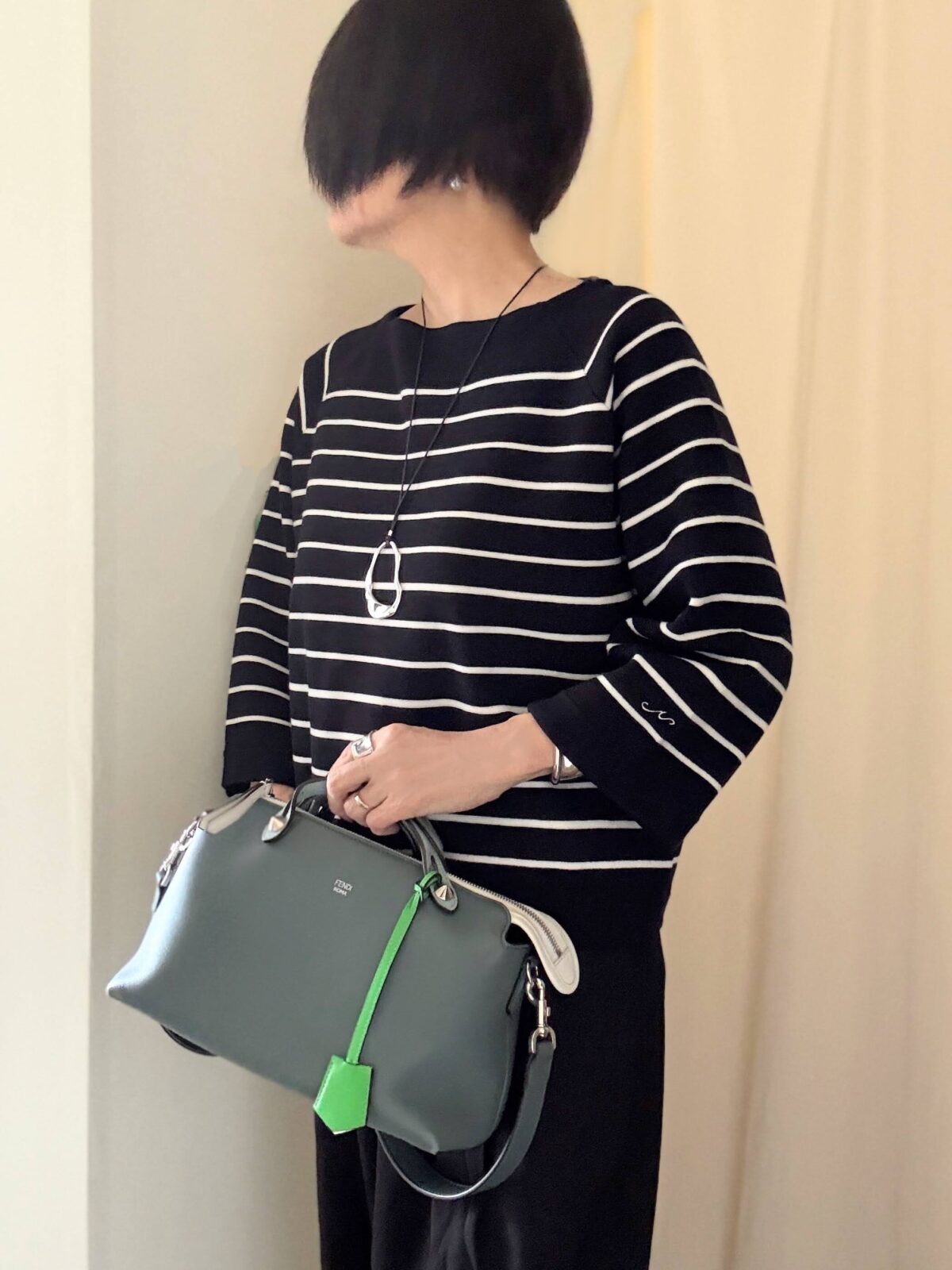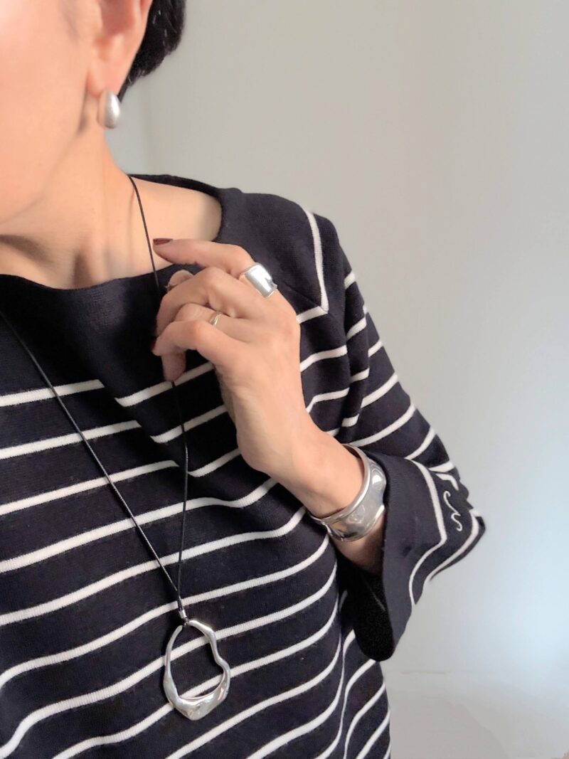 このアートっぽいペンダント、ボーダー服にピッタリ。縦ラインを作ってくれる。