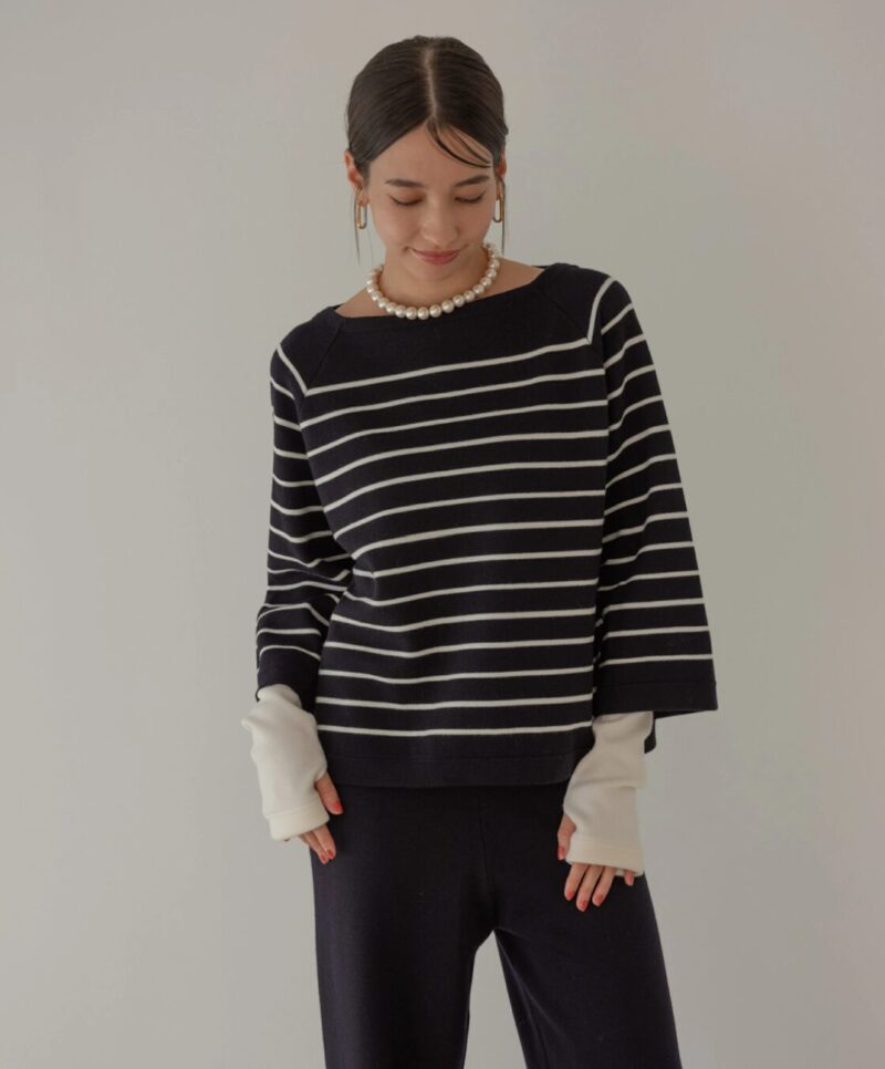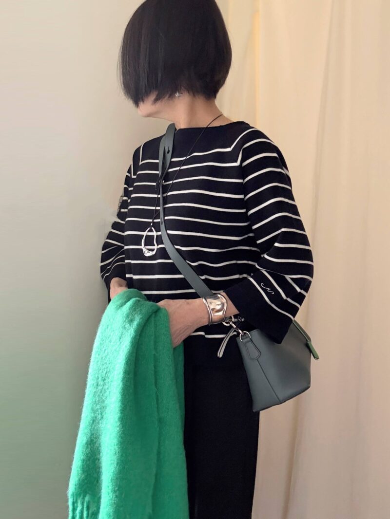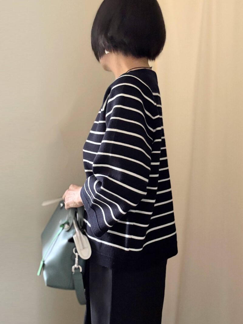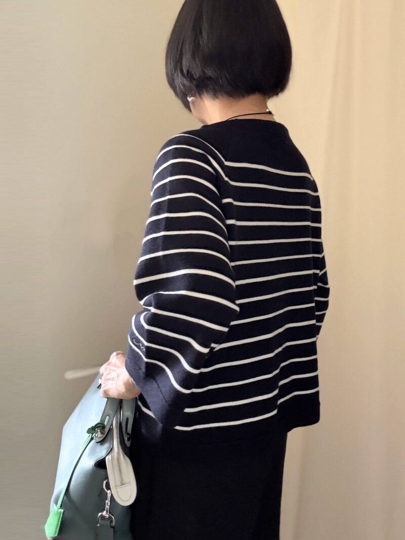 裾もやや短く全体的にスクエアな形。変に絞ったりしていないデザインが良い。身体に沿って下手にシェイプされているボーダー服とかBBA臭いですからねっ!