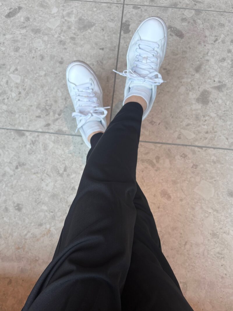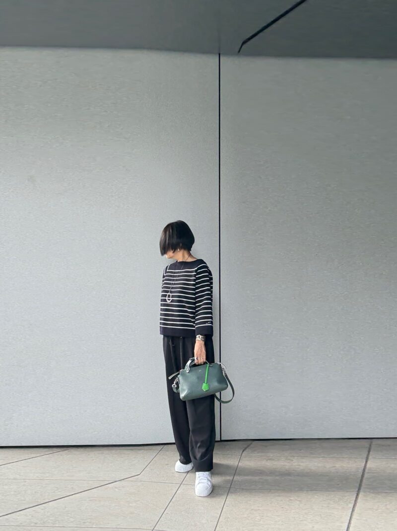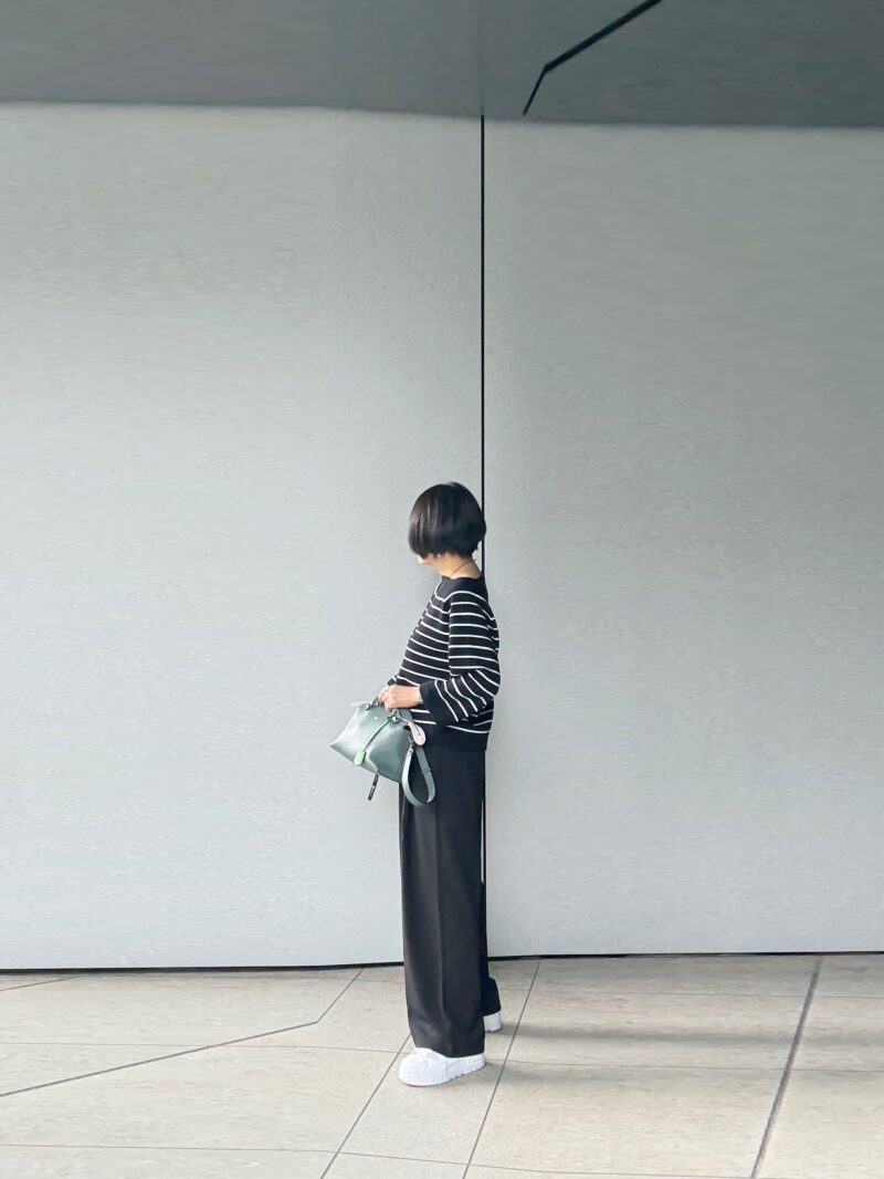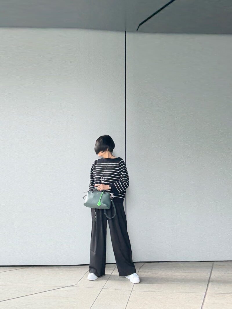 足元はスニーカーで。ボーダーが黒×白のボーダーなので、その白とリンク出来る白スニーカーはコーデに馴染んだ。