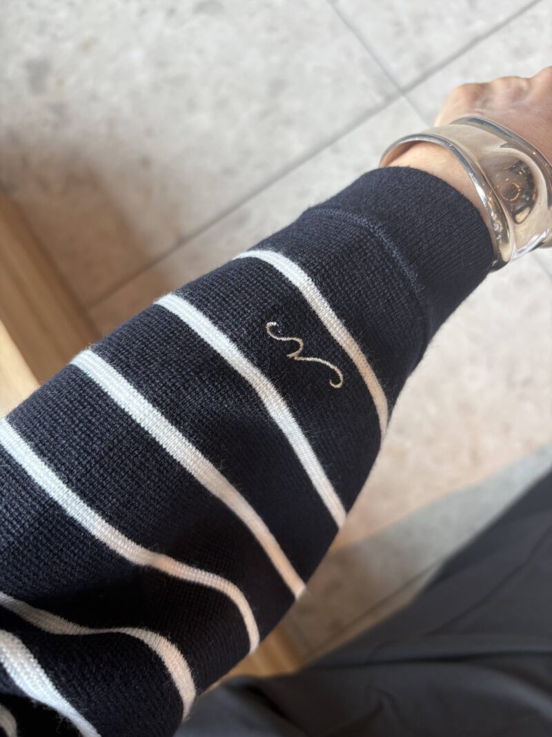 このボーダーニットの袖に刺繍があった。