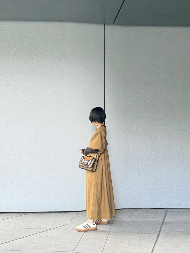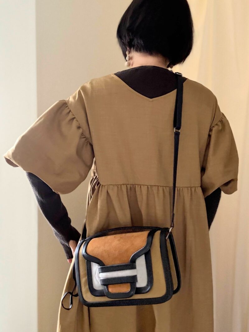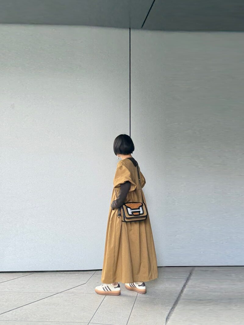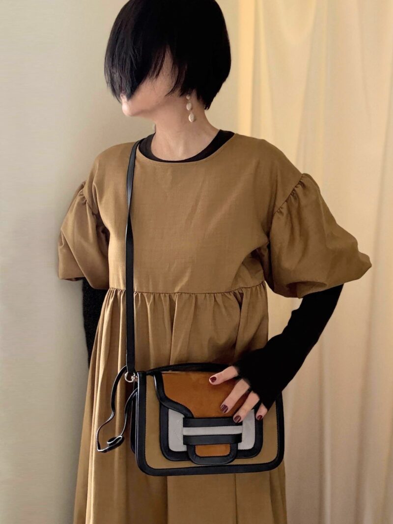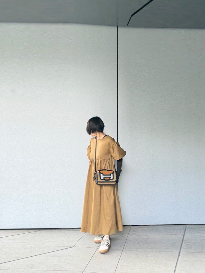 ややハイウエストに切り替えがあるワンピース。この手のワンピースは「斜め掛けのボディバッグ」が合わせやすい。PIERRE HARDYのアルファ、ピッタリ。