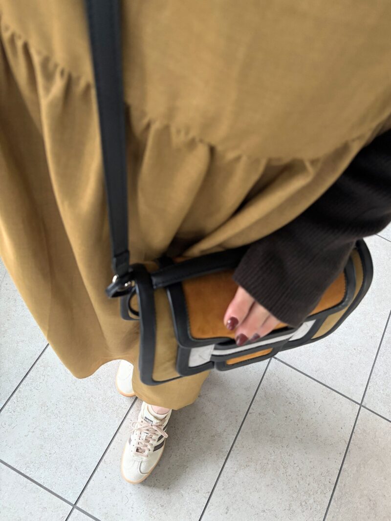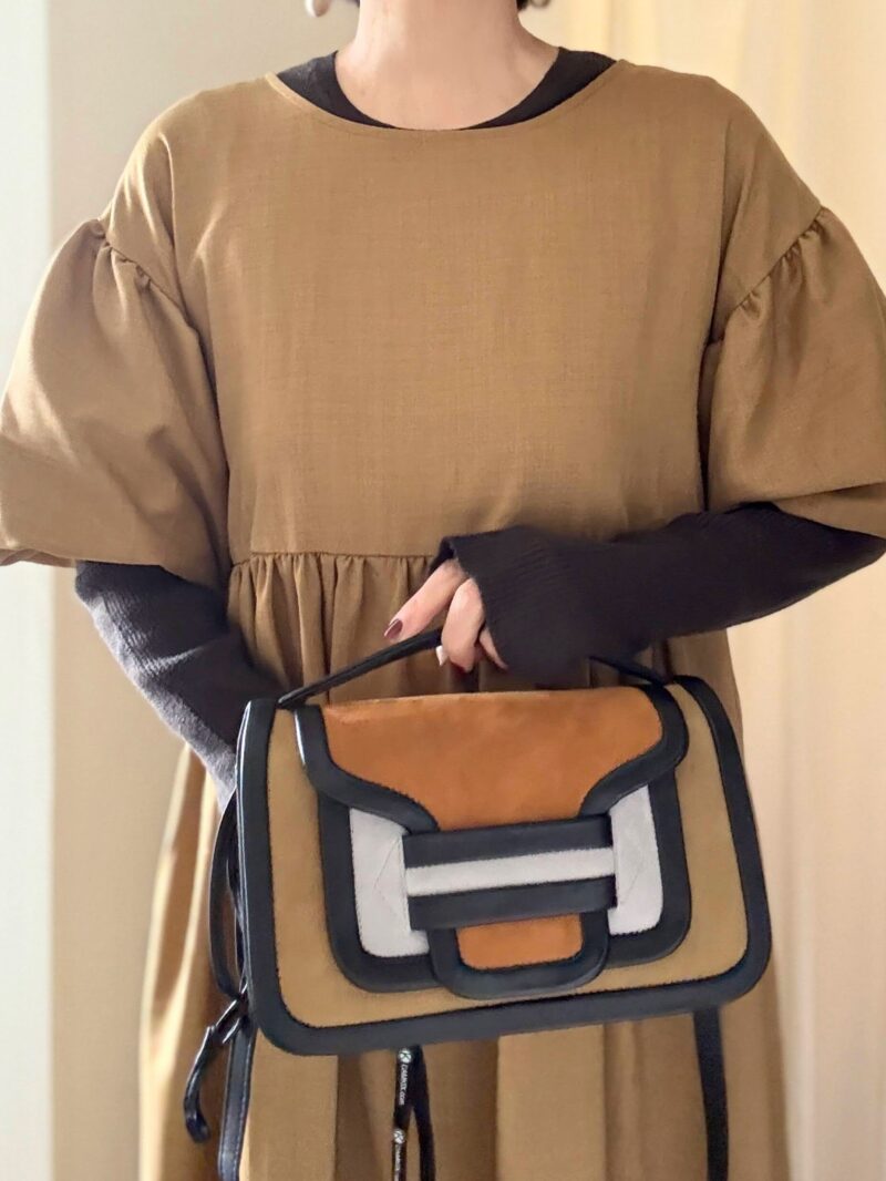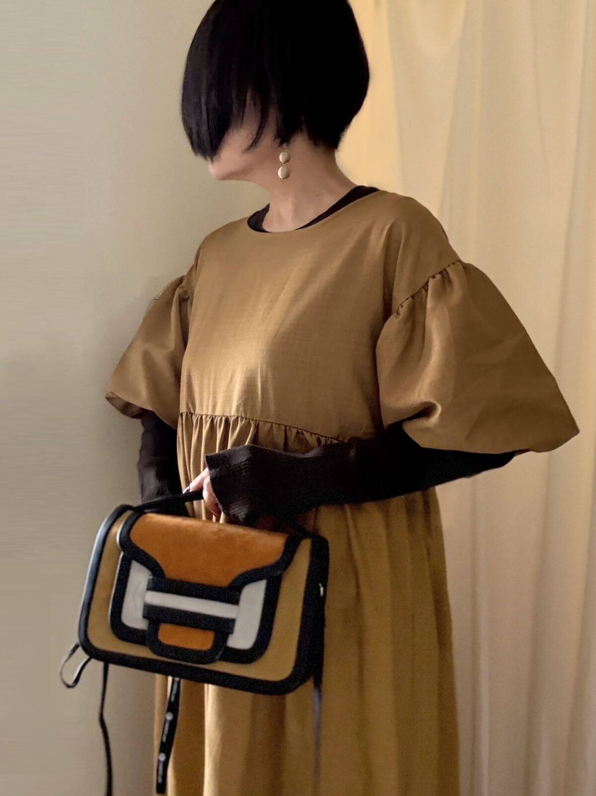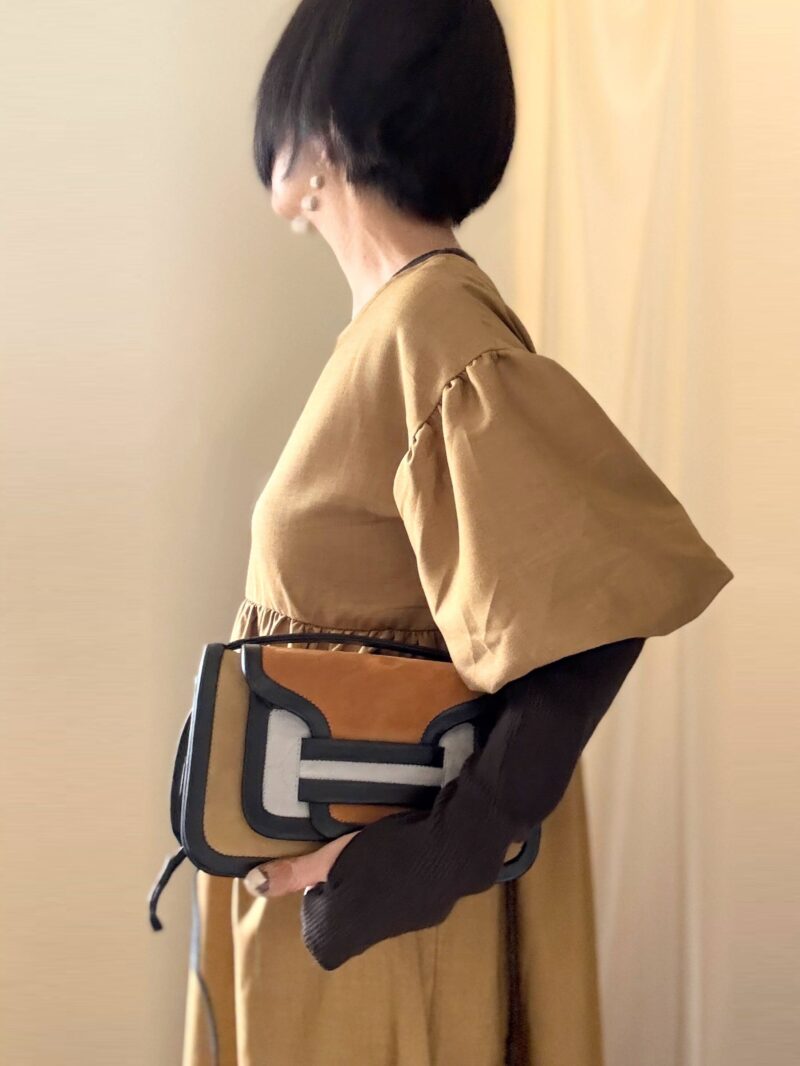 ややハイウエストに切り替えがあるワンピース。この手のワンピースは「斜め掛けのボディバッグ」が合わせやすい。PIERRE HARDYのアルファ、ピッタリ。