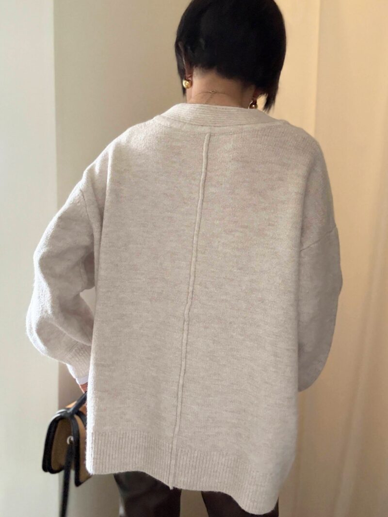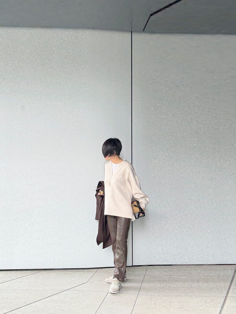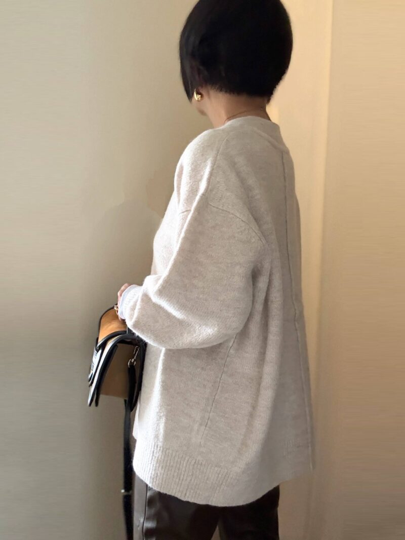 細身のパンツには大き目のゆるニットが合いますね。後ろに一本縦線入ってるのでノッペリ後姿にならないニット。
