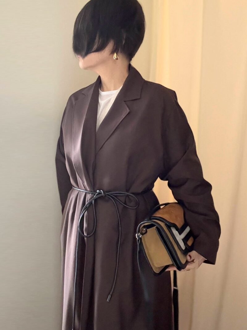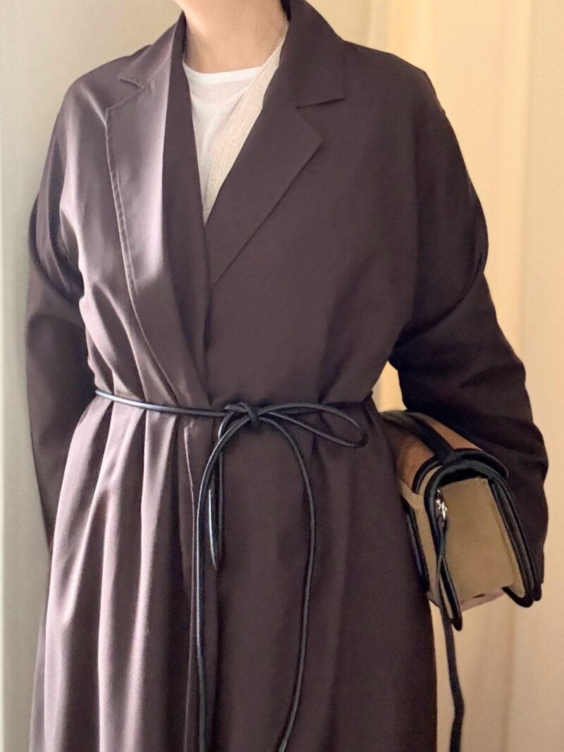 このコート、革の丸紐のベルトが付属していた↓んだけど、こうしてサラッと羽織るように着た方がいいのかも。タイトスカートと合わせる時はキリっとベルトした方が良さげ。