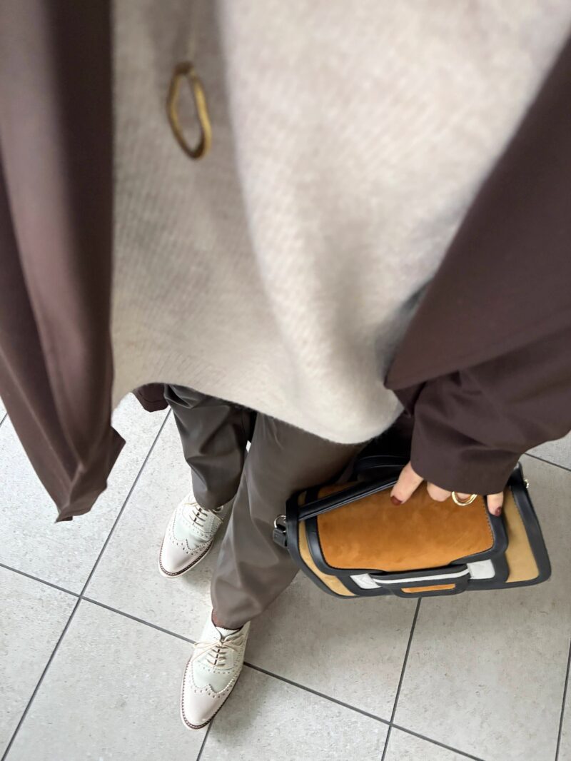 こげ茶×ベージュ系のコーデに明るさをプラスしてくれるPIERRE HARDYのアルファbag。バッグはカラフルなものを揃えるに限る!!(確信)