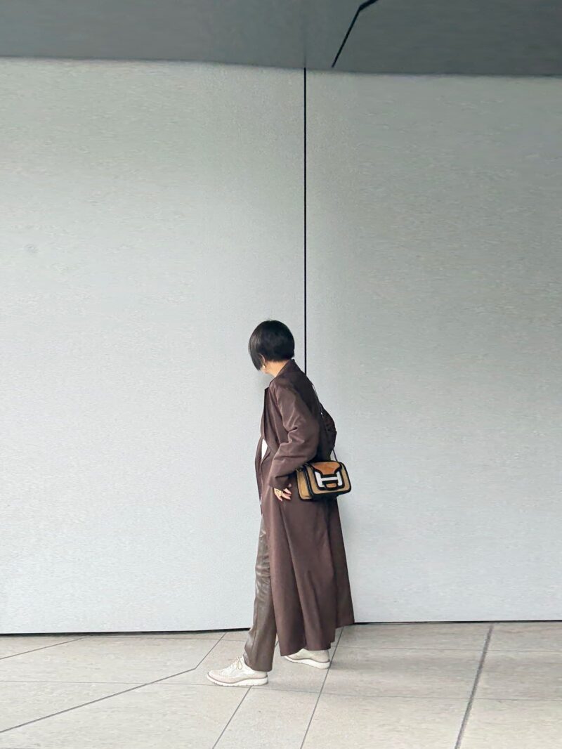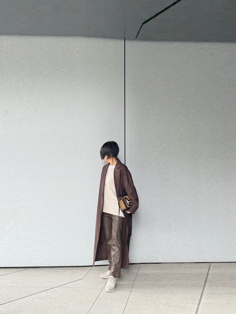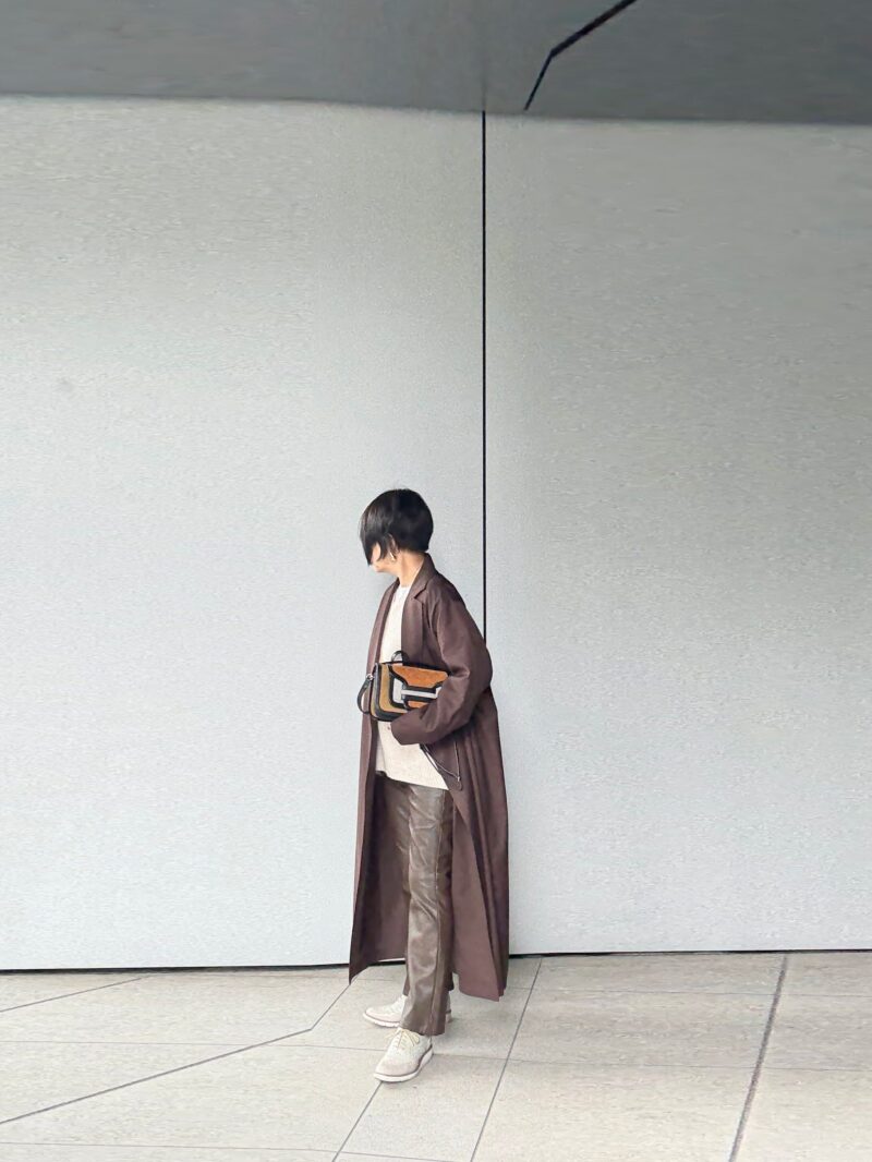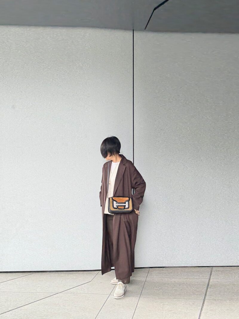 全体。このこげ茶のコート、丈が潔く長くていいわ。