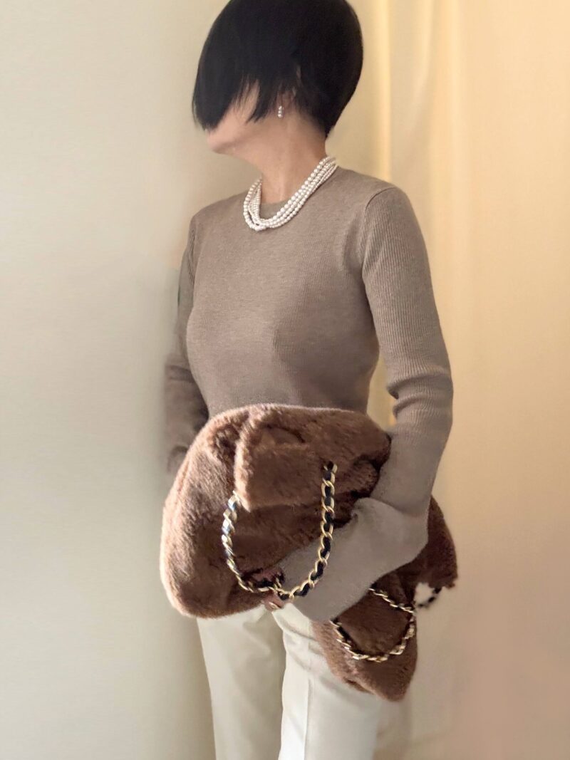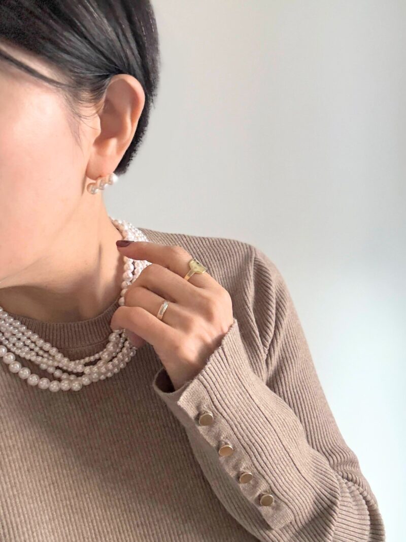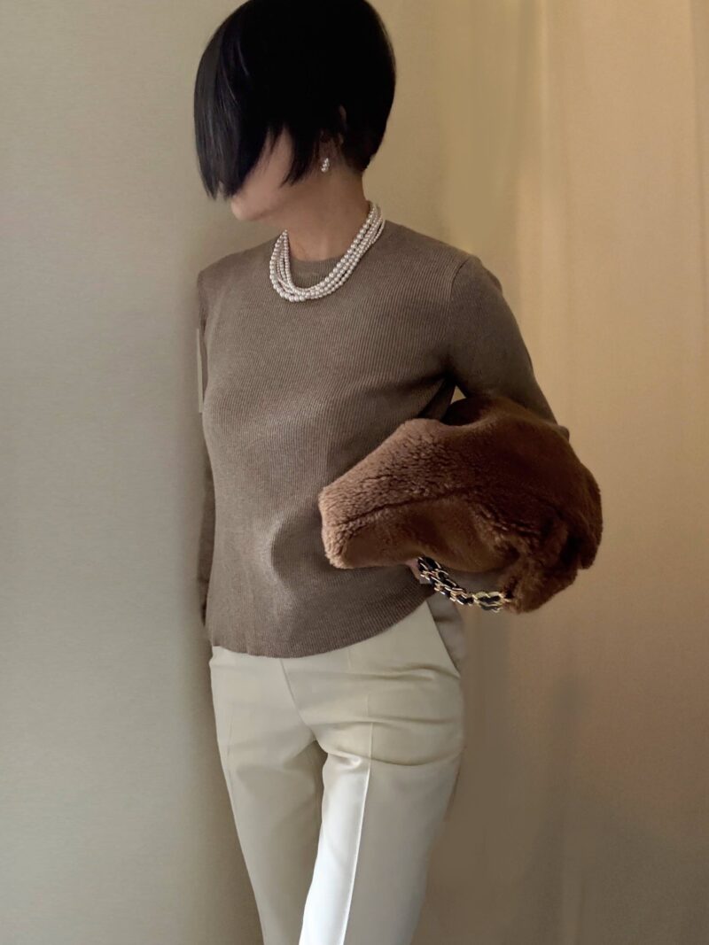 そこでリブニットという女らしいTOPSにして、パールアクセサリーという糖質の多いアクセサリーを盛る。