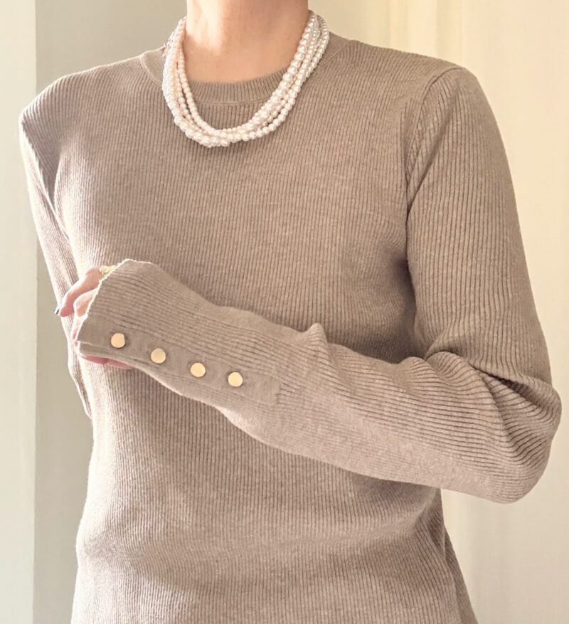 袖長め。伸縮性のいい細リブ。さりげなく身体に沿う細身ニットなのに、私のたぷ肉を拾わない。神か!(*´▽`*)