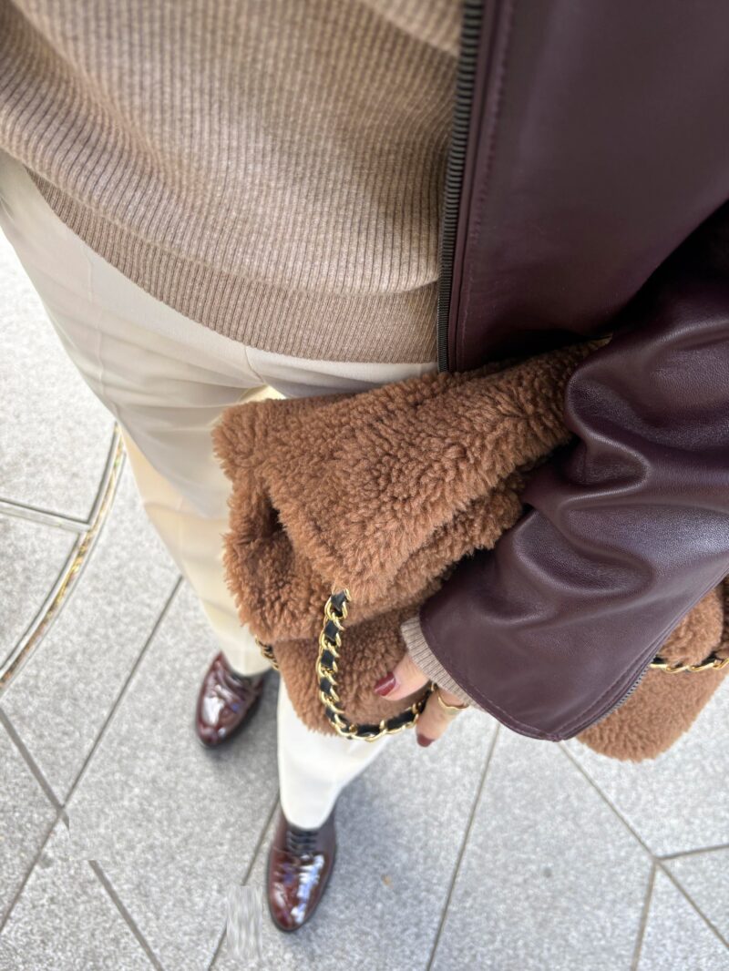 bagは溺愛ヴィオラドーロのボアbag。チェーン付いてて肩にもかけられるし、クラッチ持ち出来る。柔らかいし、持ってると手が暖かくて。もはや防寒具。