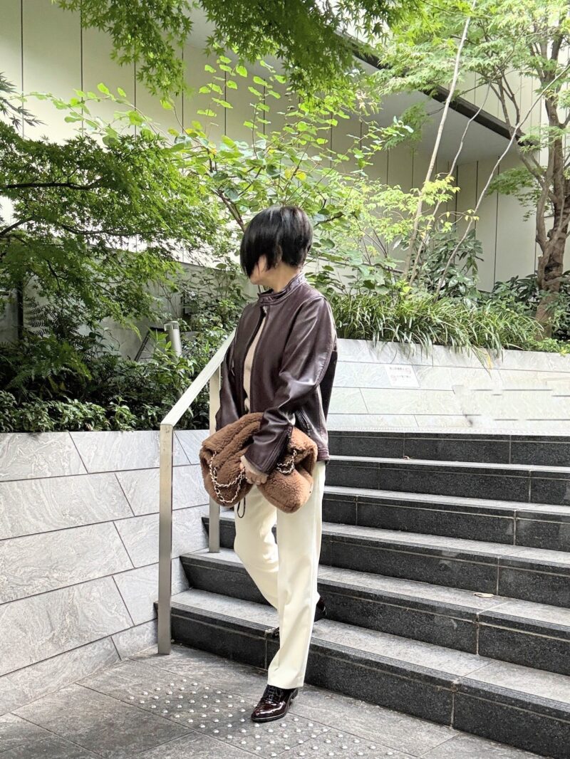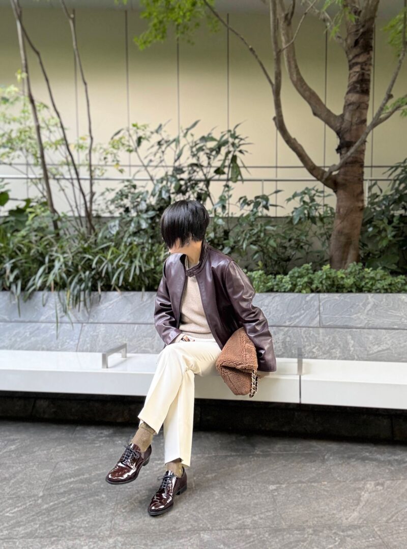 かなりこげ茶に近いバーガンディ色の革のブルゾン。このハードぉ~なアイテムにさらにセンタープレスのパンツ+ひもオジ靴。という辛口ハードなコーデ。