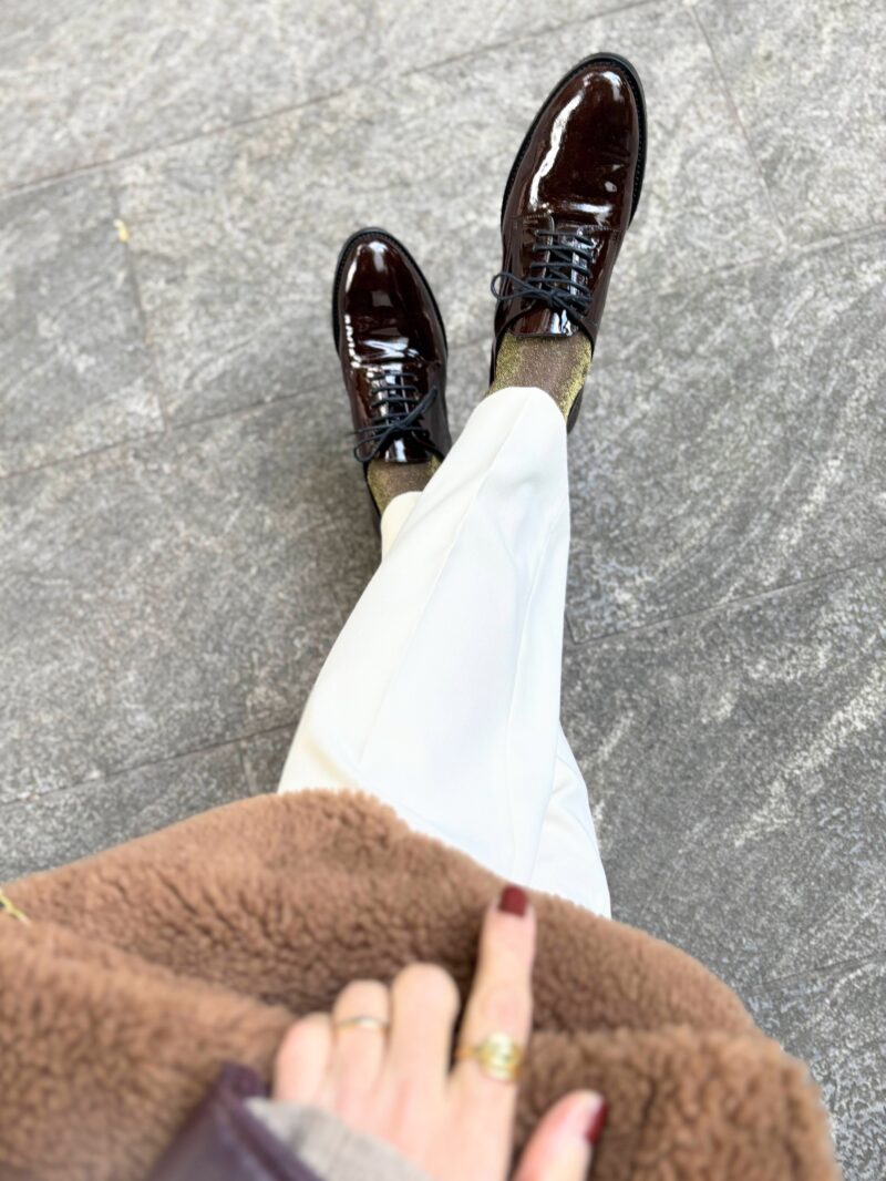 エナメル風の輝きが気に入ってるこげ茶寄りのバーガンディ色のひも靴。イタリアっぽい靴。