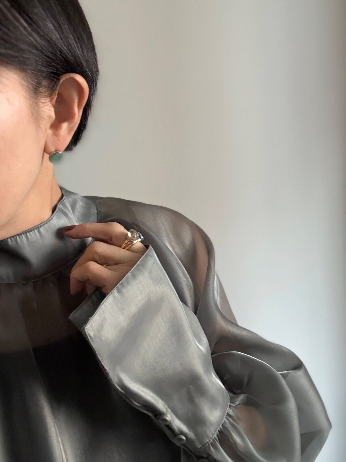 アクセサリーは控えめ小さめ。緑のピアスと色石の指輪のみ。