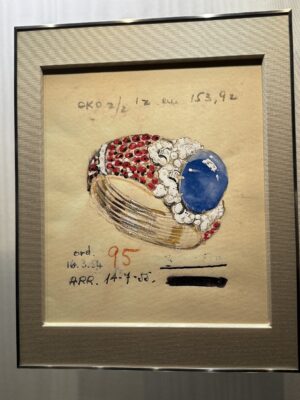 ↓指輪に見えるけどバングルなのよ~。真ん中のサファイアの大きさよ・・・。デザイン画も素敵。裏側見えないところまで凝った細工がしてあってまさに美術品。