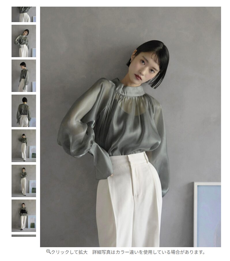 かなり透けるブラウスなんだけど、色が渋く、ハイネックで肌が覆われているせいか、意外と落ち着いた感じになった。
