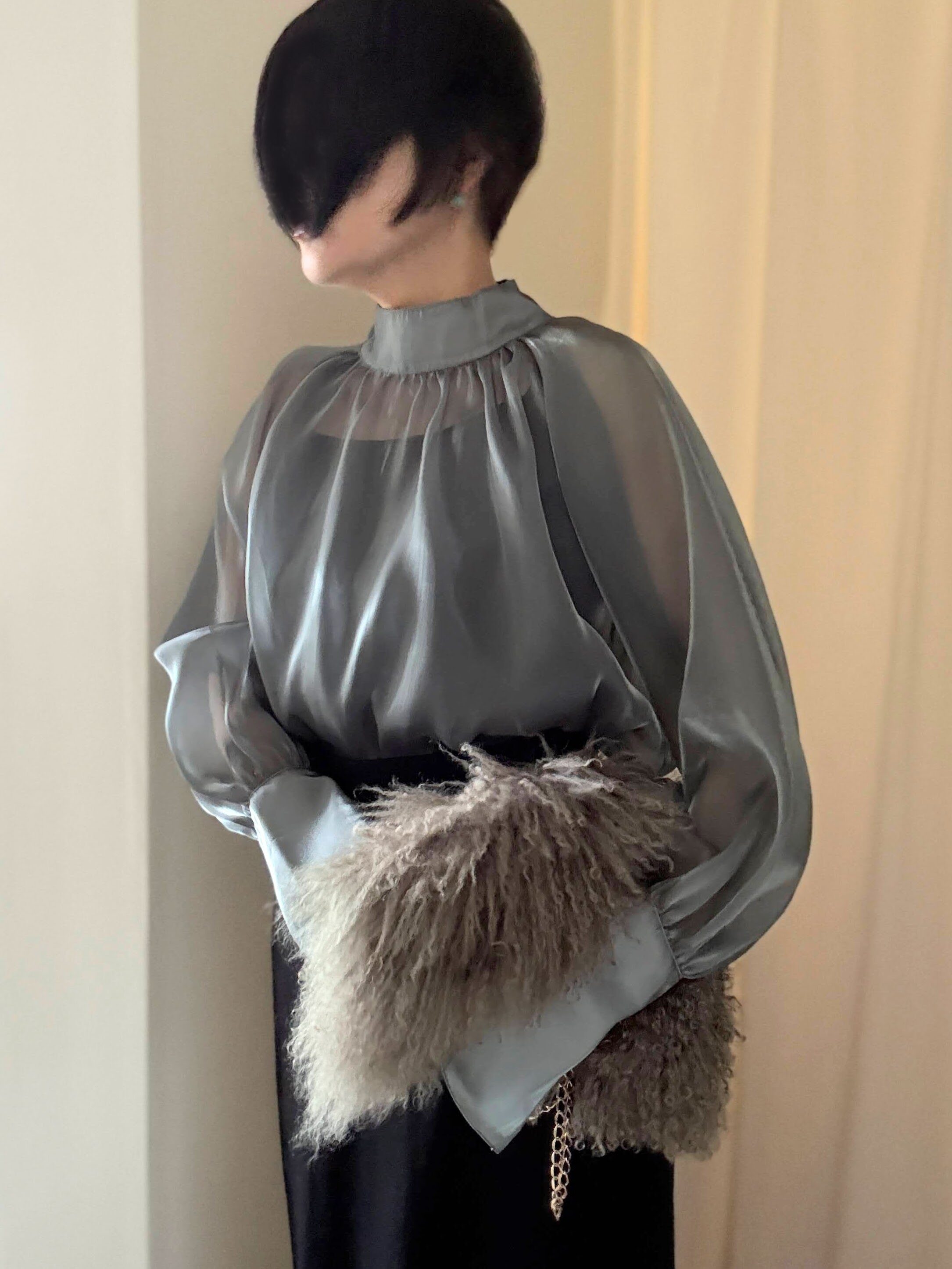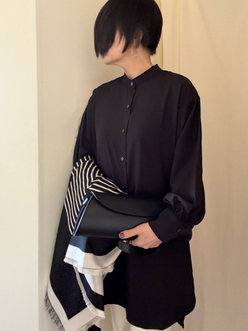 今日着ている黒のシャツはテロンとした素材で丈が長ーーい。バンドカラーが好み。バンドカラーって一気に端正感と辛口テイスト出るので個人的にすごく好き。襟元の処理やインナーに悩まなくて済むのもいい。