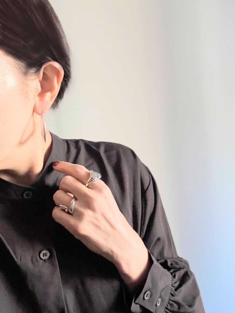 アクセサリー。シルバーのフープピアスとシルバーの指輪の重ね付け。