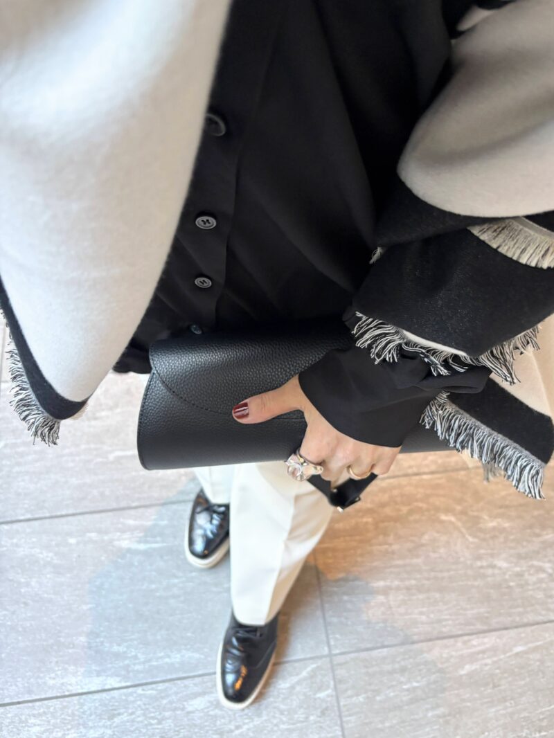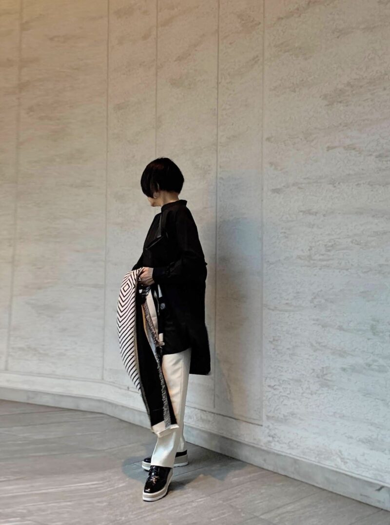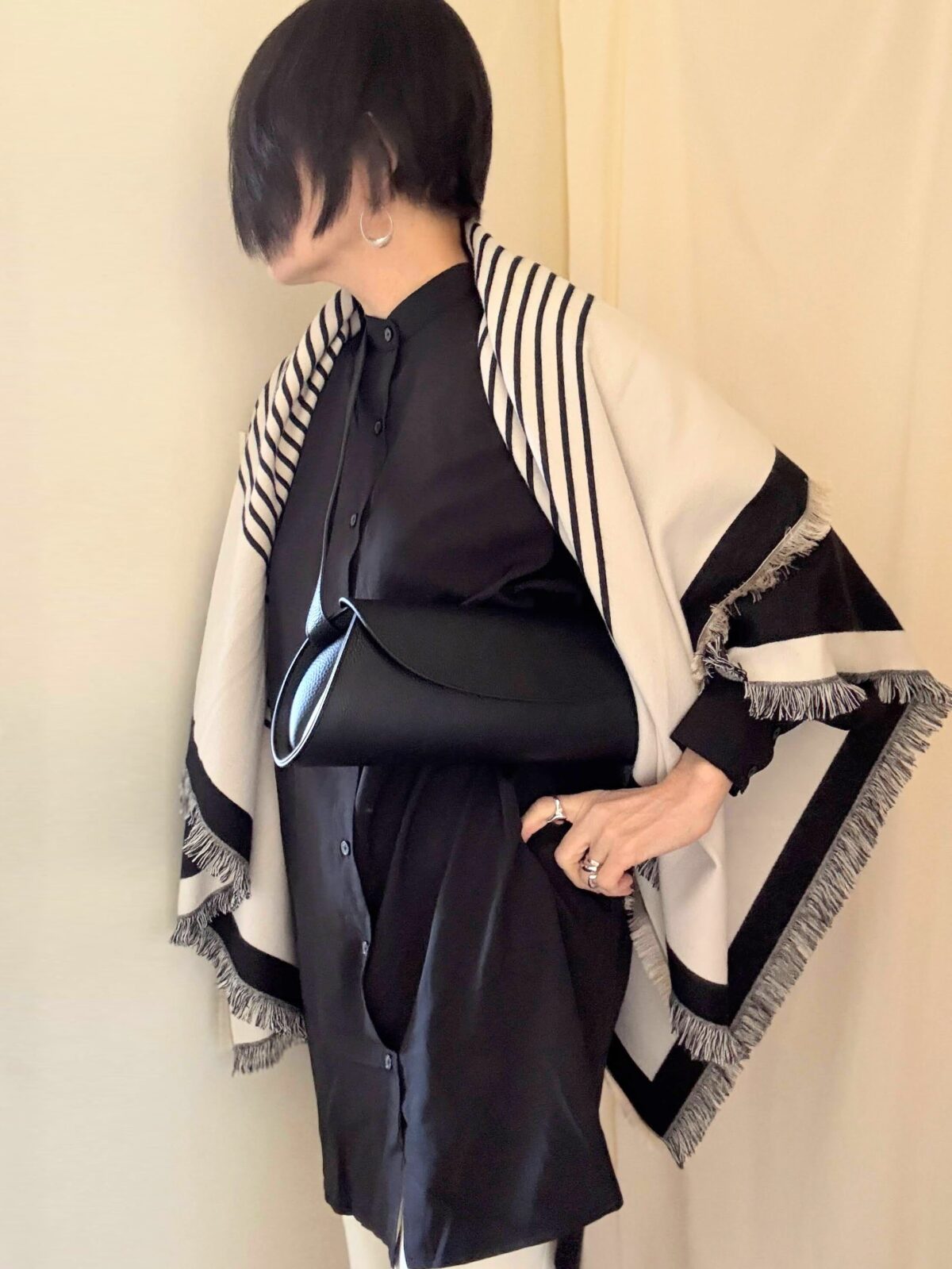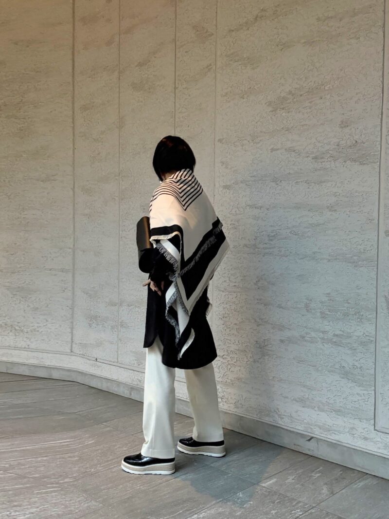 この大判のリバーシブルのストール。白黒コーデの時に映える。白と黒の色の分量バランスを調整するのにこんな便利なストールはない。名品!