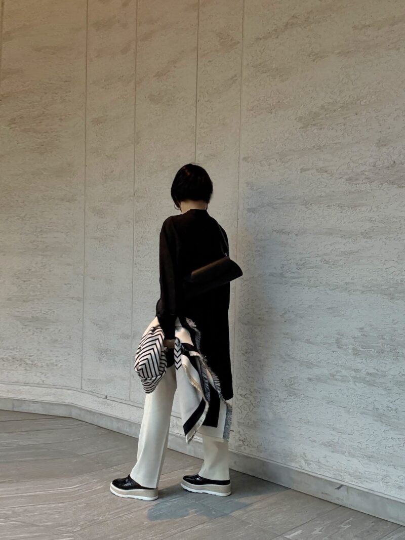今日は潔く白と黒のモノトーンコーデ。黒はもうあまり積極的には着ないのだけど、時々「シャープな白黒コーデしたい!!」熱が高まるので、そんな時は手持ちの白と黒を集めてコーデする。