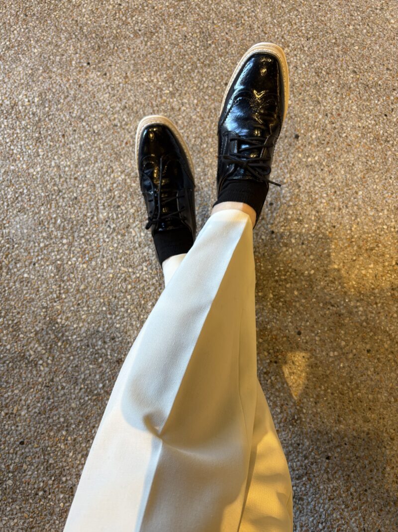 足元。黒のひも靴。ひも靴だけど、ジュート底で歩きやすいの。