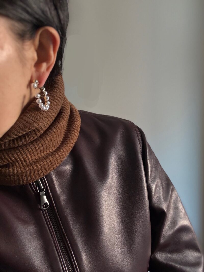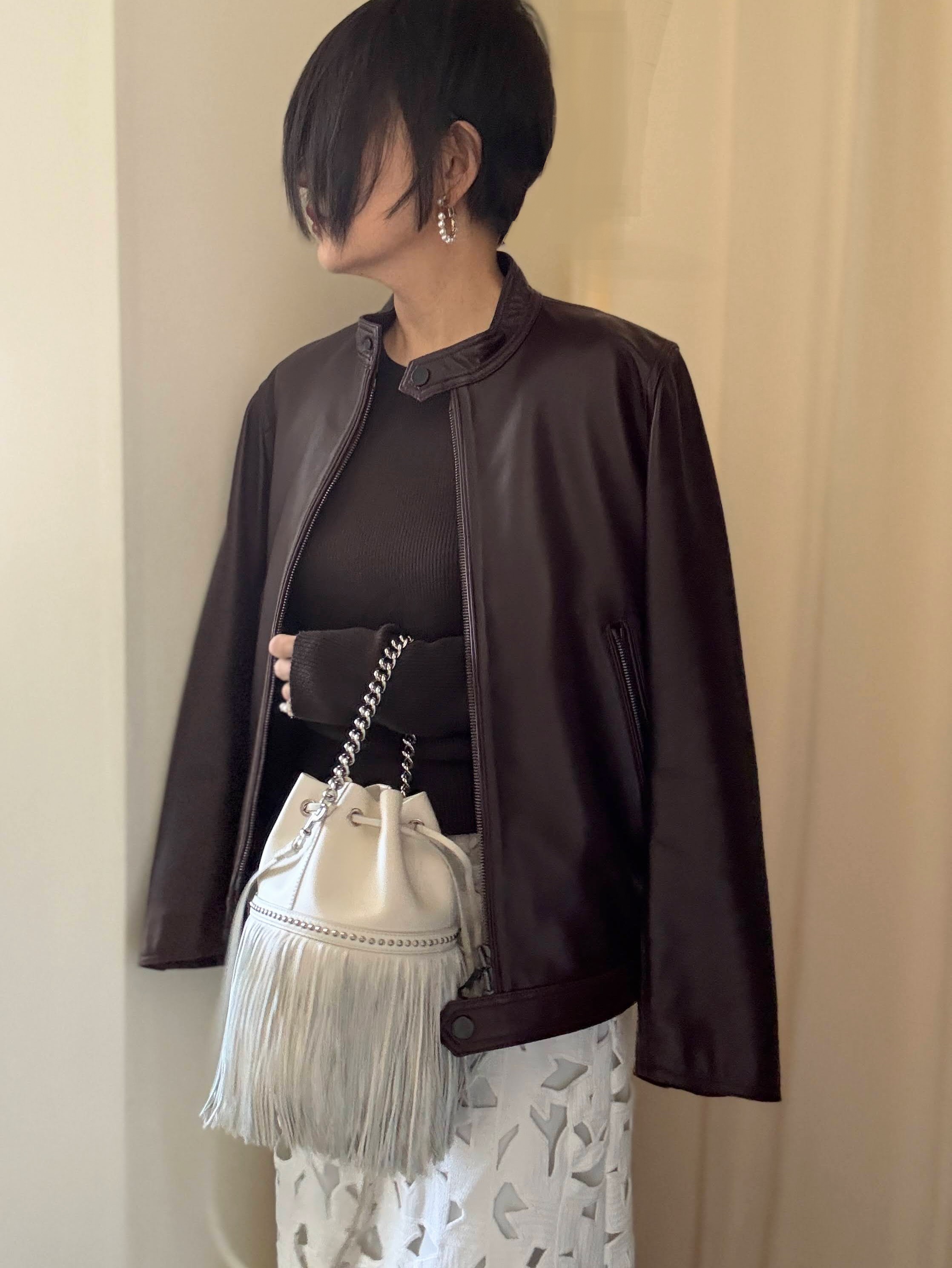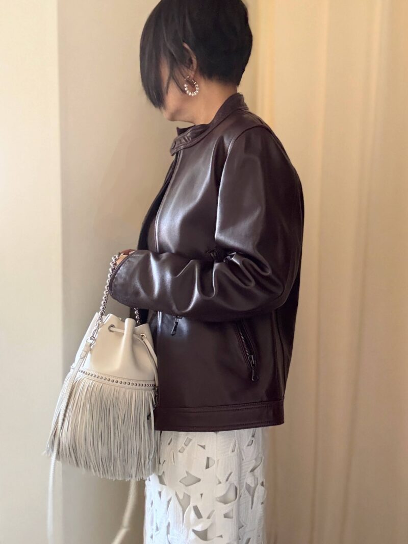 黒の革ジャンと合わせて白黒の辛口寄りにしても良いのだが、バーガンディ色の革ジャケット持っているので「茶系の甘辛MIXコーデ」にした。
