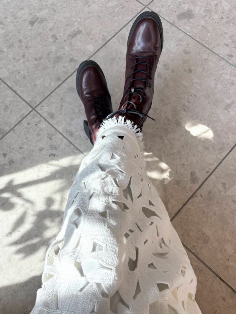 ヒールパンプスと合わせない、コンサバコーデにしない。そのあたりがこのレース編みのスカートをコーデする時のポイントかと。