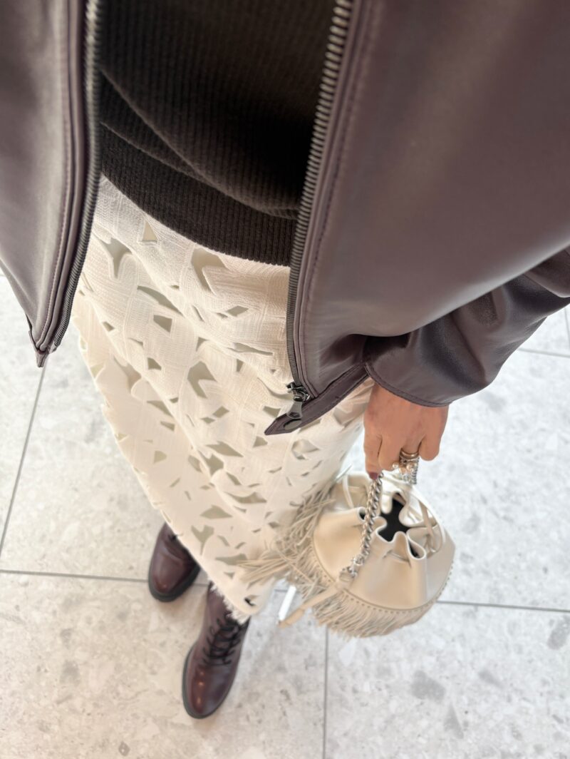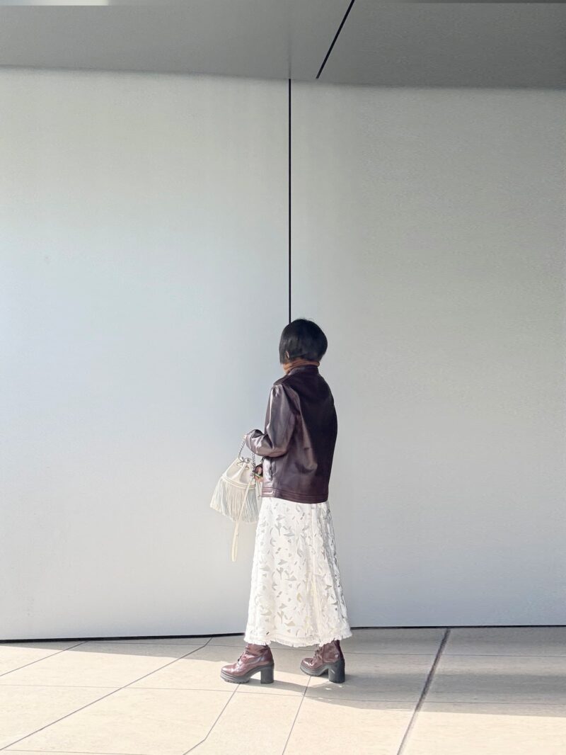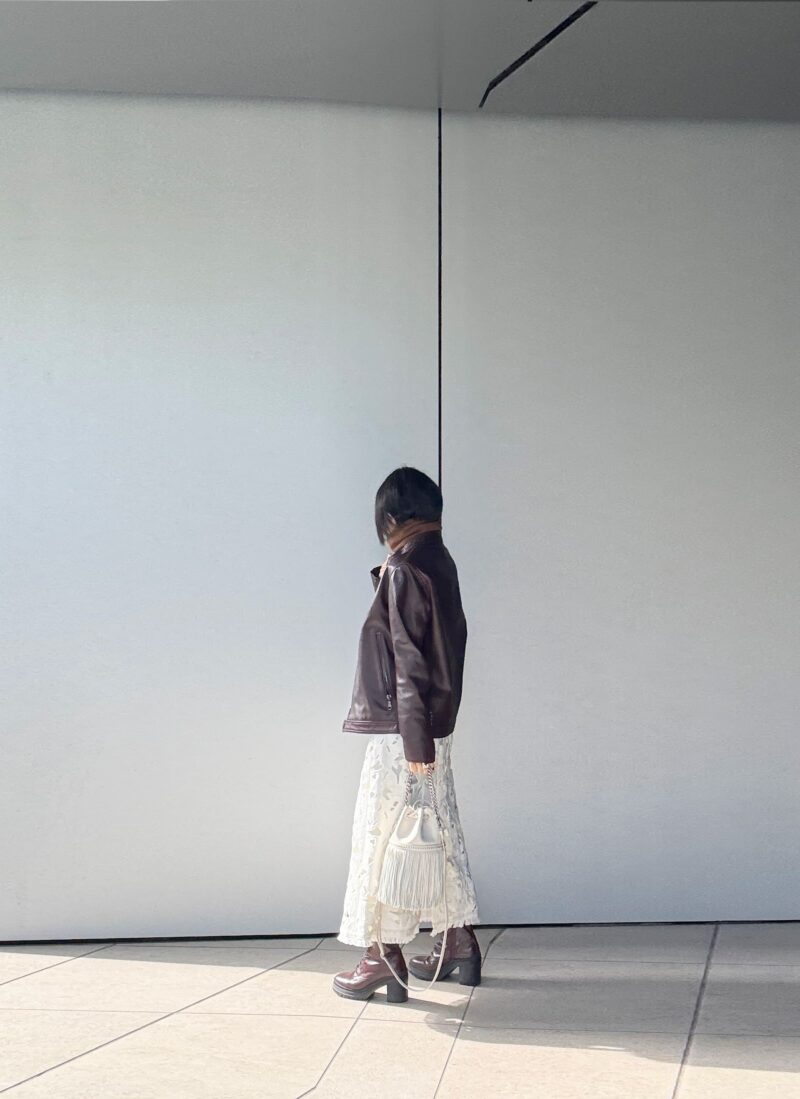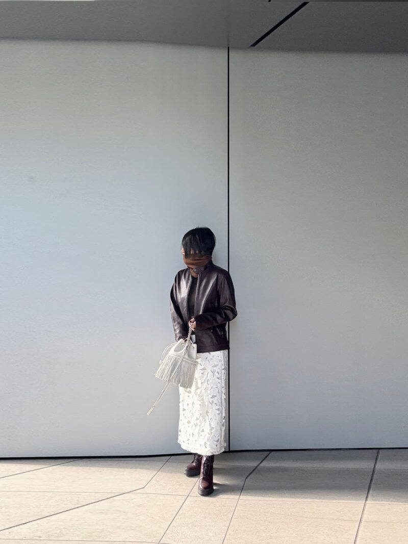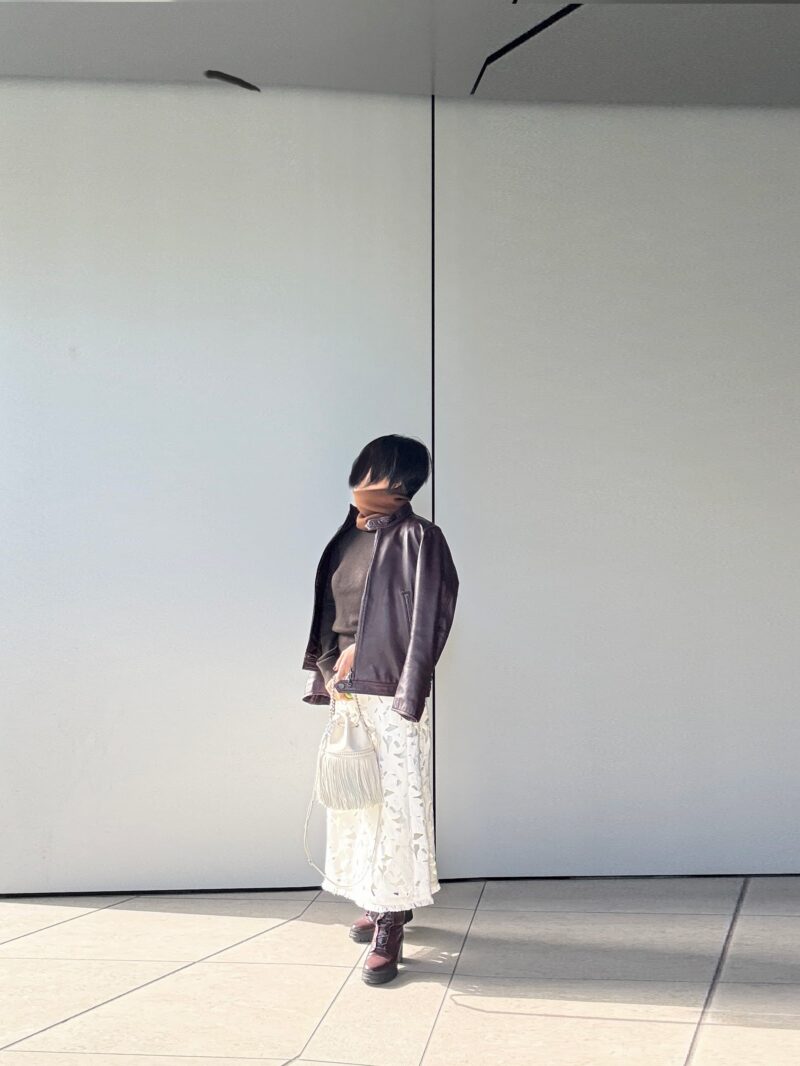 レース編みのスカートと革ジャン! 大人の甘辛MIXコーデ