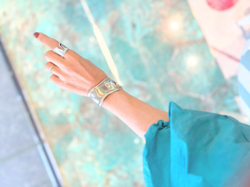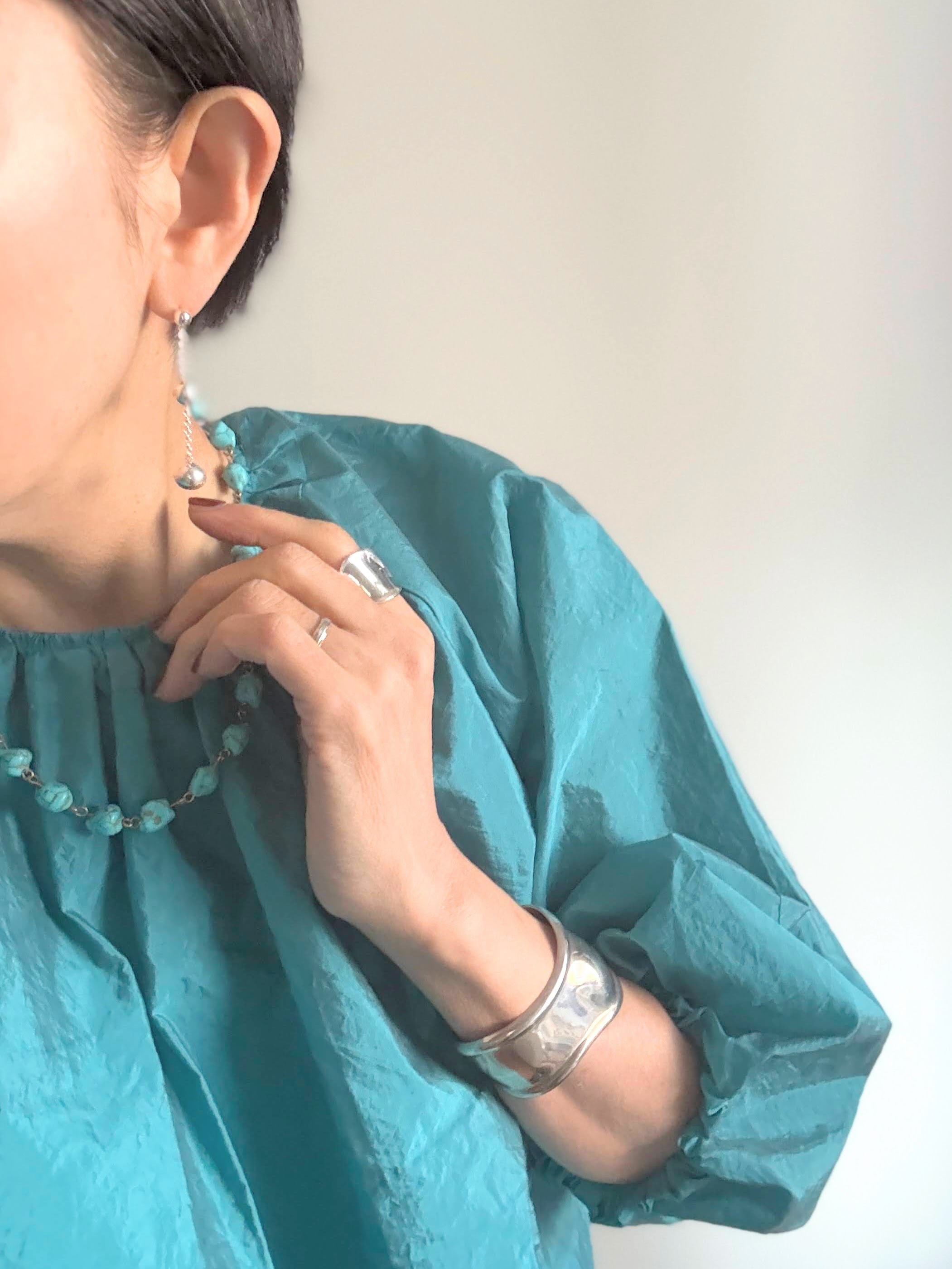 アクセッサリーは当然tiffanyで。ペレッティのボーンカフ。それにブラウスの色合わせでターコイズのネックレスを。