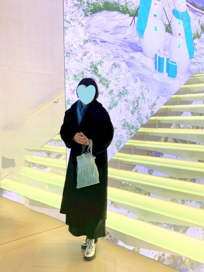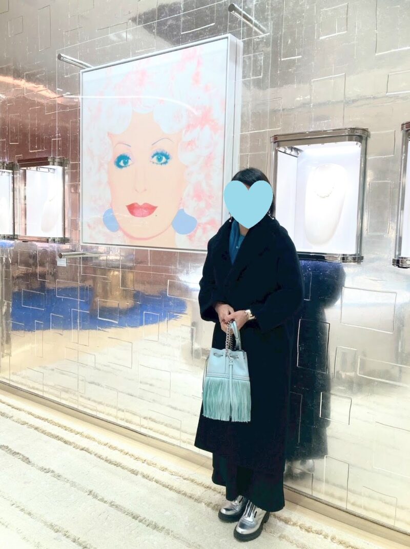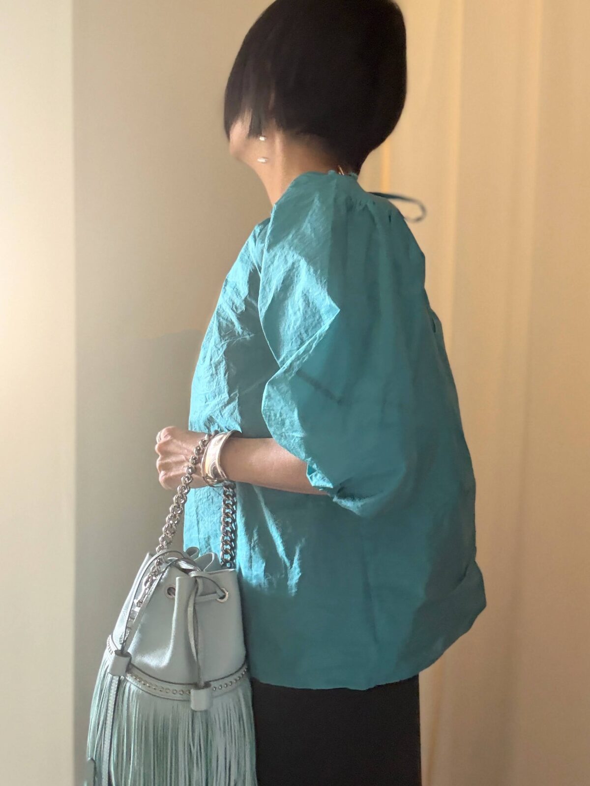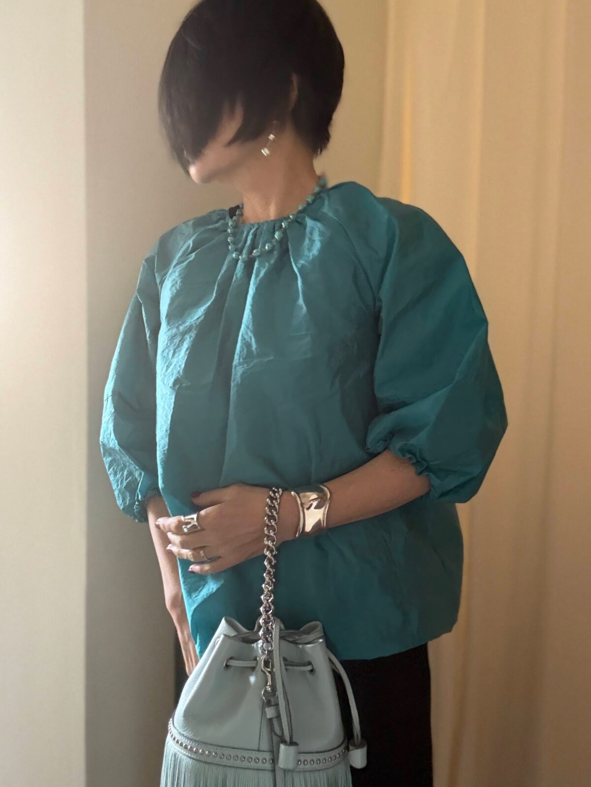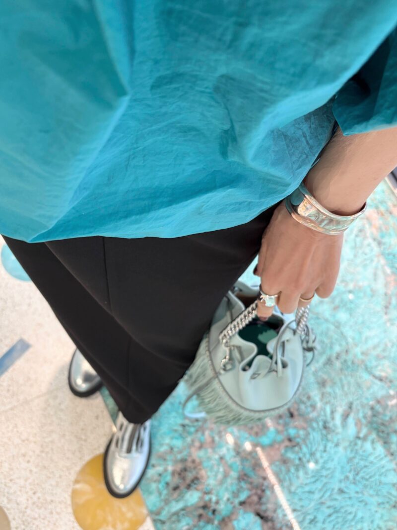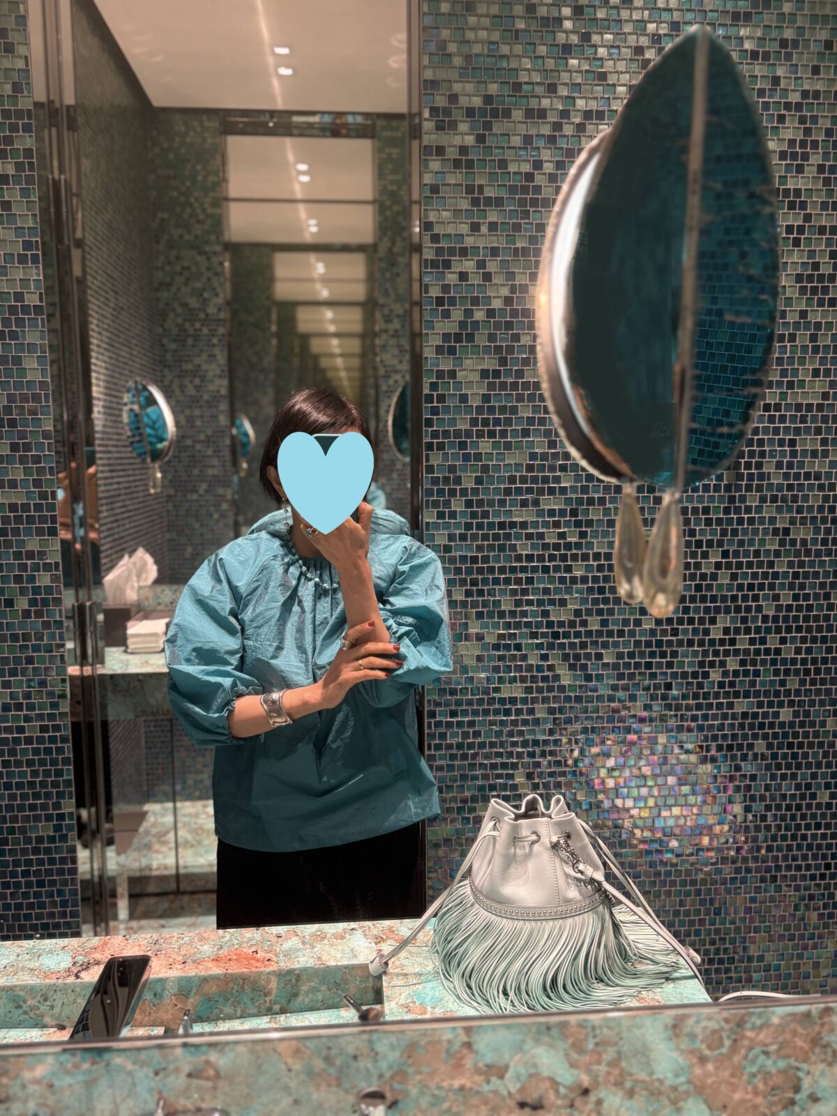 当然コーデはブルーを基調に。ドンピシャなティファニーブルーの服が無かったので手持ちの服で一番近い色のTOPSをチョイス。光沢あって華やかだしいいかな?と。
