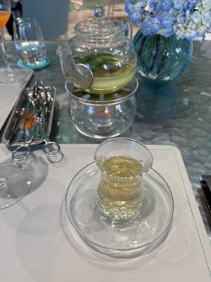 ジュースの後に胃にやさしいお出汁のスープが出たんだけど、これが美味しかった。トマトとフルーツの前菜。かなり本格的。フレンチのシェフが監修しているメニューなんだとか。納得。